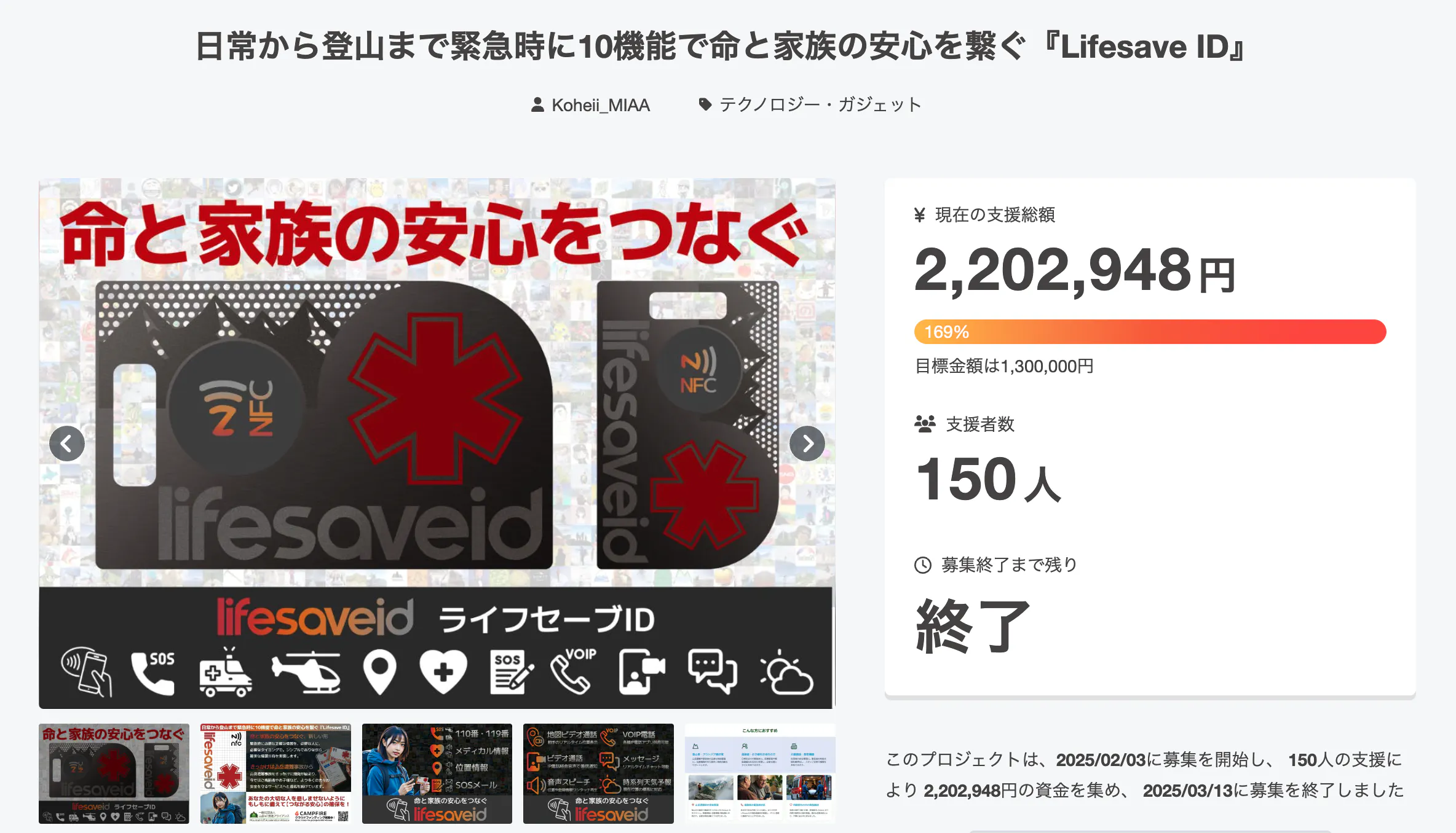 前回の「日常から登山まで緊急時に10機能で命と家族の安心を繋ぐ『Lifesave ID』」プロジェクトでは、開始からなんと1週間で目標金額を達成し、最終的には150人もの方から約220万円という多額の温かいご支援をいただきました。