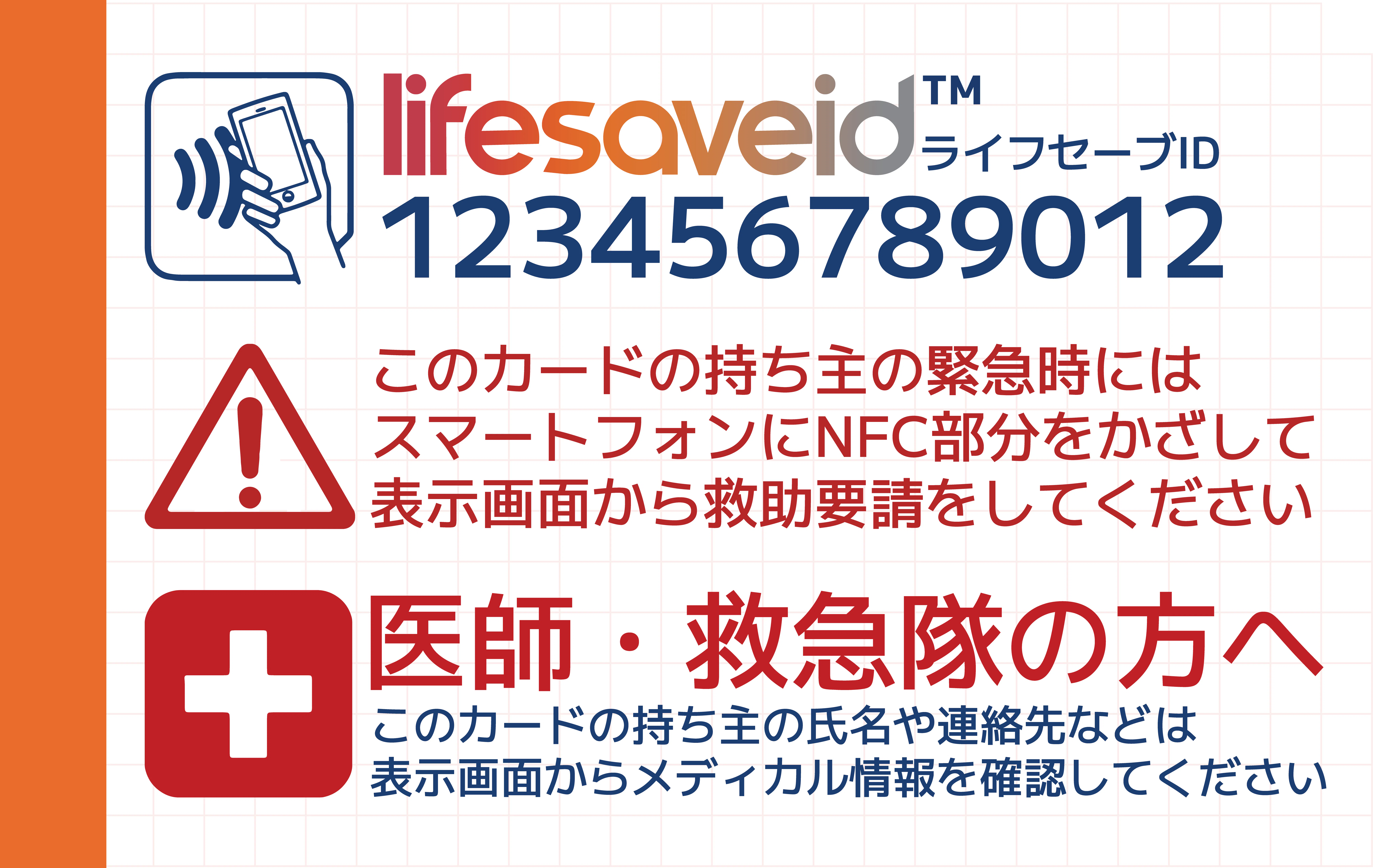 | 外側(青色面) | Lifesave ID™ロゴ、ID番号、NFCマーク、緊急時の説明文、 | 緊急時の即応に最適な「セーフティフェイス」 |