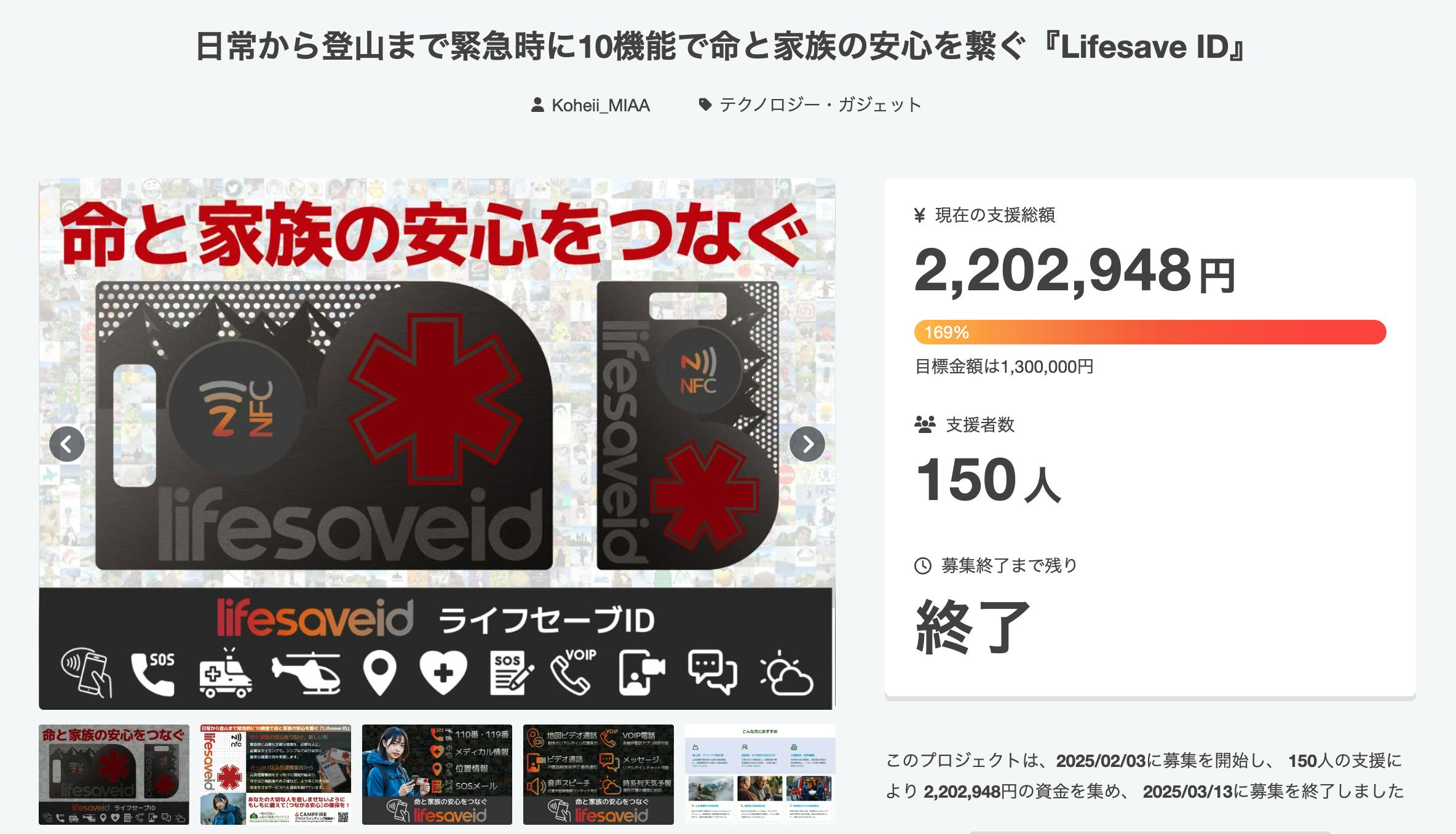 前回の「日常から登山まで緊急時に10機能で命と家族の安心を繋ぐ『Lifesave ID』」プロジェクトでは、開始からなんと1週間で目標金額を達成し、最終的には150人もの方から約220万円という多額の温かいご支援をいただきました。