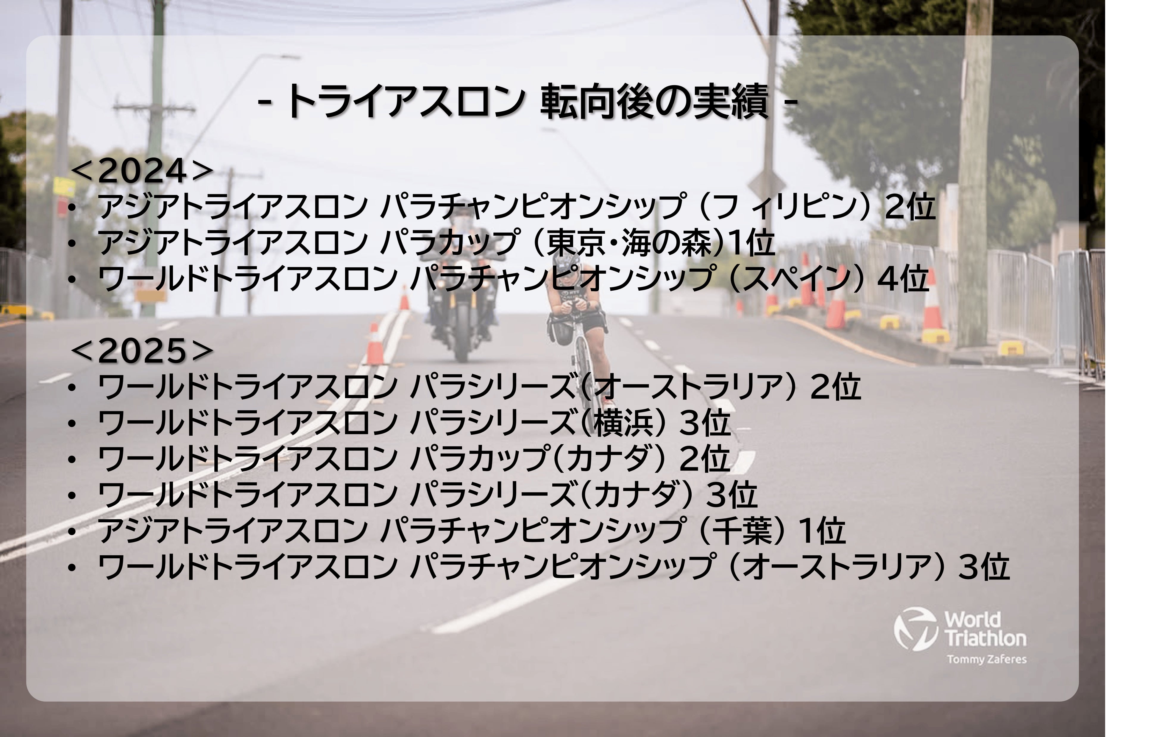 2026/03/15 09:512026年シーズンの初戦は、昨年世界シリーズ戦で初めてメダルを獲得した思い出の地・デボンポートで迎えました。3月9日に東京での合宿を終え、そのまま現地へ。何度経験しても、新しいシーズンの始まりには心がワクワクします。今回はレースの結果と、今の私の現在地をご報告させていただきます。 【レースレポート】タスマニア島は夏の終わりですが、朝晩は10度を下回る冷え込み。レース当日も受付時点の気温は10度。スタートまで3時間ほど間があったため、身体を冷やさないよう注意を払って準備を進めました。例年、波や風が強くハードなコンディションになりがちなデボンポートですが、今年は海も穏やかで、比較的レースしやすい気象条件。PTS2クラスは3名の出場。日本のベテラン秦選手、そして世界ランキング1位で昨年シリーズ4連勝中の強豪・ANU選手(オーストラリア)との三つ巴の戦いでした。■ スイムスイムが得意な秦選手が序盤から先行し、ANU選手が私の後ろにつく展開。秦選手から1分遅れで、ANU選手とほぼ同時にスイムアップしました。スイムからバイクへの準備(トランジション)ここもタイムに含まれる需要なパートです■ バイクバイクが圧倒的に強いANU選手が早々にトップへ。ここで大きく離されたものの、これまで4分近くついていた差を今回は3分以内に抑えることができた点は良かったです。バイクの降車ラインからトランジションエリアまではバイクに乗ってはいけないため、片足ケンケンで移動します。■ ランスタート直後に秦選手をかわして2位へ。しかし、トップとの差を詰めるには至らず、逆に20秒弱リードを広げられる展開に。さらに、トランジションでの規定違反(スイムキャップとゴーグルをボックスに収め忘れたため、規定により10秒ペナルティ)という初歩的なミスもありました。最終的には4分13秒差でフィニッシュ。一番得意とするランで勝負しきれなかったことは悔しいですが、世界のライバルたちが進化を続ける中、私も確実な一歩を踏み出せていると感じています。2028年ロサンゼルス・パラリンピックを見据え、この悔しさを次への糧にしていきます。そして今回は、選手・スタッフ計22名の「TEAM JAPAN」が一丸となって世界の強豪に挑戦しました。それぞれのクラスや役割の垣根を越え、互いに鼓舞し合える最高のメンバーです。そんなチームの一員として戦えたことを誇りに思います。---【支援者の皆さまへ】今回は、シーズンの始まりに自分の現在地を改めて確認できたという意味で、非常に意義のあるレースになりました。こうして世界の舞台で挑戦を続けられているのは、間違いなく皆さまのご支援と応援のおかげです。皆さまからいただいたサポートが私の挑戦を確実に前へ進めてくれ、レース中の苦しい場面でも「応援してくださる方々がいる」という思いが大きな力になりました。心から感謝しています。次戦は5/16(土)、横浜・山下公園で開催されるWorld Triathlon Para Championships Yokohama に出場予定です。今回見つかった課題を一つずつ克服し、より強い自分でスタートラインに立てるよう準備していきます。引き続き応援よろしくお願いいたします。 もっと見る