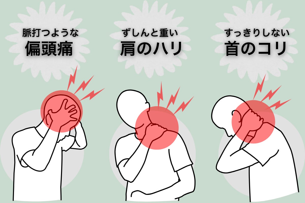 「スマホ首」「PC首」は、溜まった乳酸などの疲労物質が肩の神経を刺激して肩こり・頭痛を起こします。