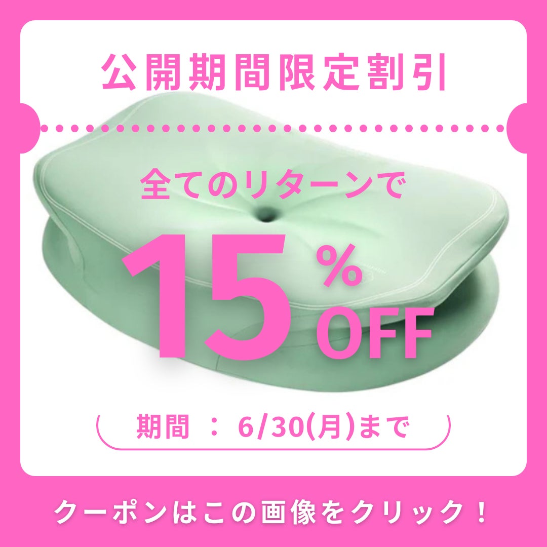 整体マクラkarenの普及を加速させ、一人でも多くの人のスマホ首・PC首を癒したい!思いきって15%OFFクーポンを発行しました。「追加よもぎパック」も含め、すべてのリターンに適用です。