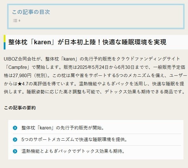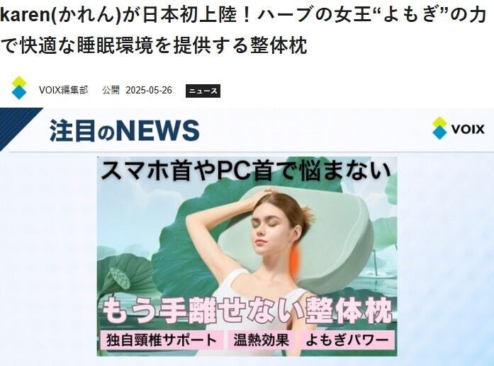 「karen(かれん)が日本初上陸!ハーブの女王“よもぎ”の力で快適な睡眠環境を提供する整体枕」として紹介されました!