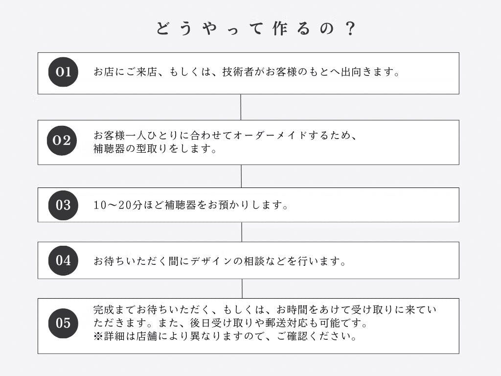 【A】製作時間は、片耳で約1時間、両耳で約2時間が目安です。事前にご予約いただければ、当日お待ちいただいてのお渡しも可能です。また、型取り・デザイン選定・お支払いを事前に済ませていただければ、後日お受け取りいただくことも可能です。仕上がり後に再度ご来店いただき、フィッティングをしてお渡しします。すでに型取りがお済みのリピーター様で、フィッティングが不要な場合は、LINE等でデザインや仕様をご相談の上、郵送でのお届けにも対応可能なお店もございます。詳しくは、各店舗までお問い合わせください。また、破損やヒビが入った場合は修復も可能ですので、お気軽にご相談ください。