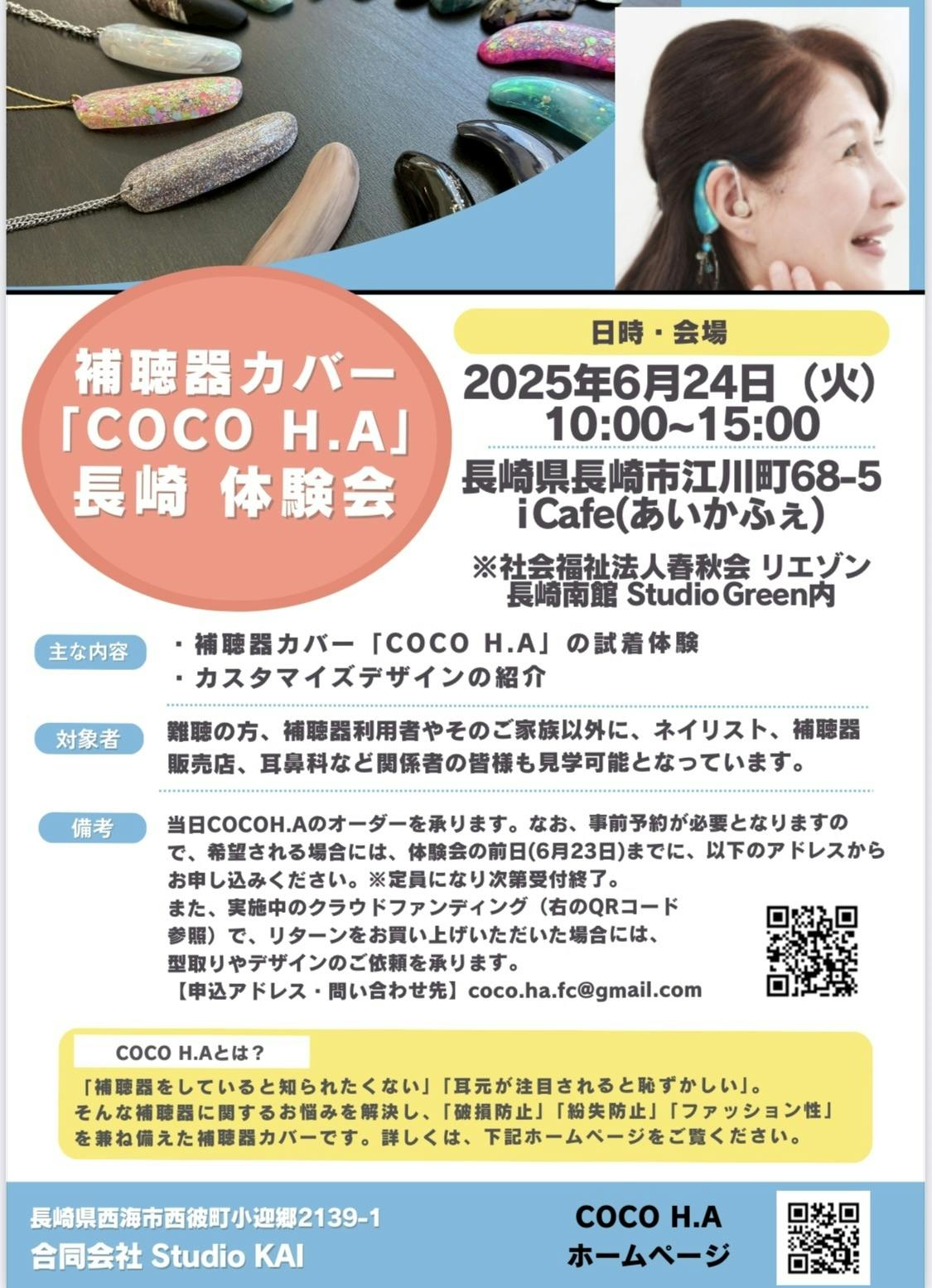 長崎でCOCOH.A体験を開催しましたまだ、補聴器を持たれて無い方からその場でご注文をいただきましたが(-。-;とりあえず補聴器作ってきてくださいねとパンフレットと名刺お渡しました。補聴器作ってお喋りの場にも行けるようになると良いですね!お洒落はネイルとお化粧だけと言われてましたが、これなら着けたいとの事でした。