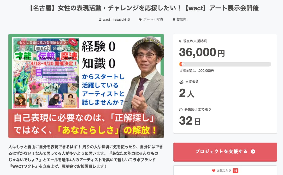 現在、クラウドファンディングプロジェクトは、公開から11日が経過し、2名から36,000円のご支援をいただいております。お気に入り登録での応援15名の皆さん、ありがとうございます!