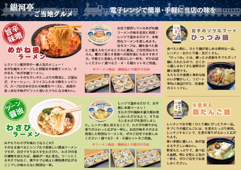 銀河亭に来れない方にも、当店の味をお届けしたいとの想いから開発した銀河亭人気商品をお届けします。