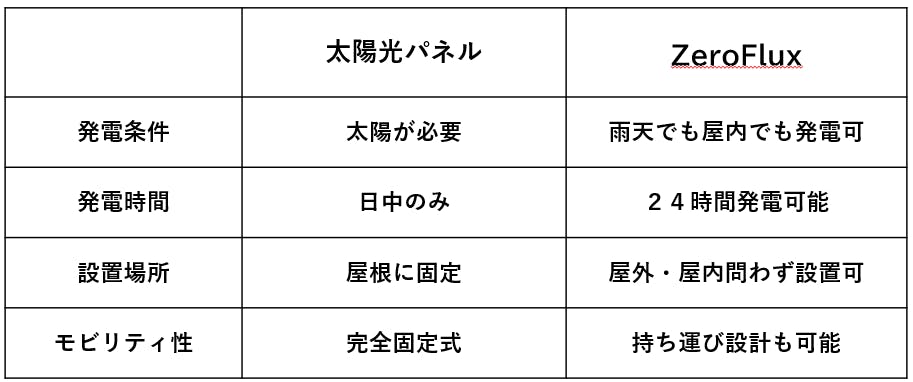 ZeroFluxは、従来の太陽光発電や風力発電、水力発電の課題を解決し、安定した発電が可能です。また、小型・軽量化に成功し、家庭用・企業用の両方で利用できる設計 となっています。