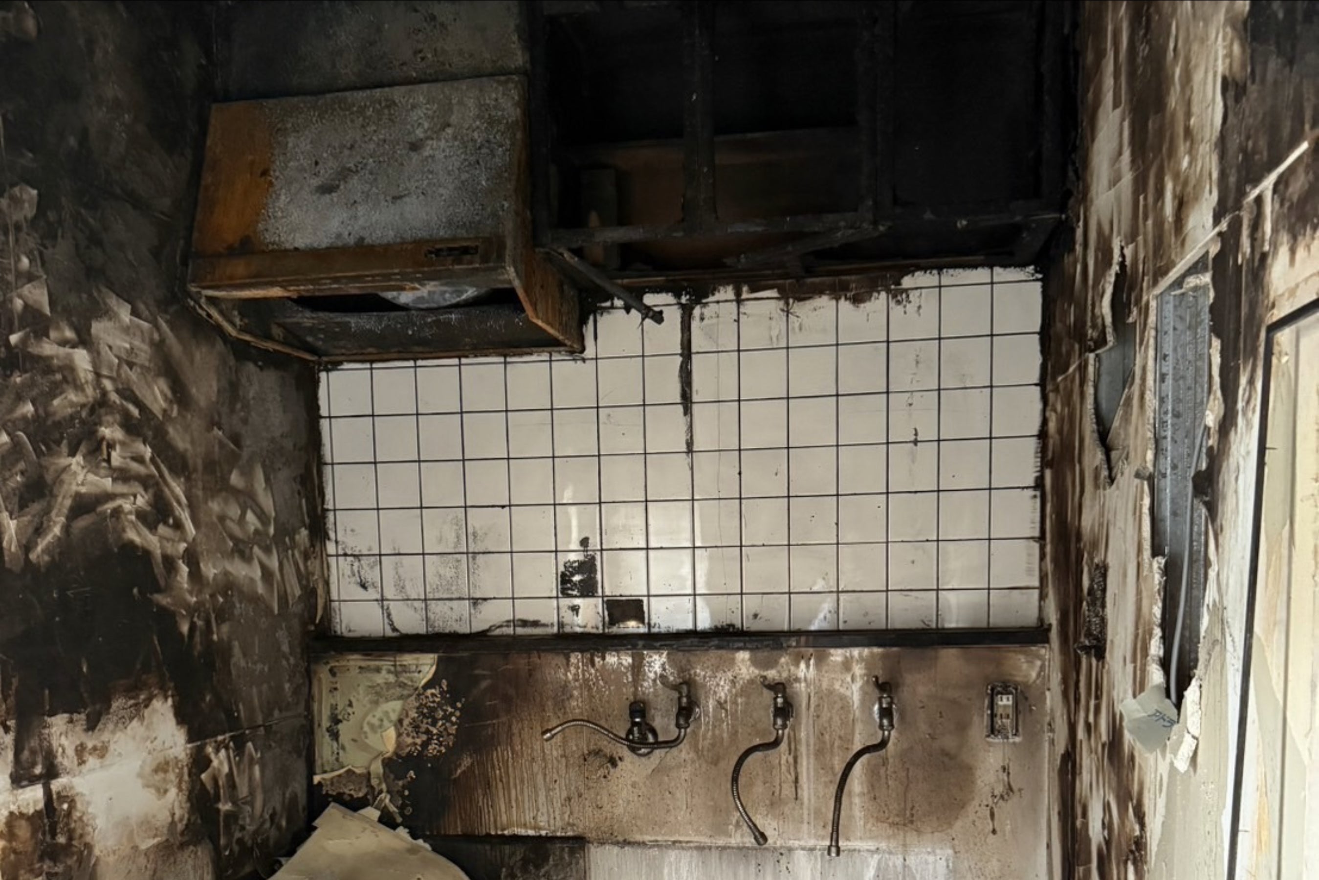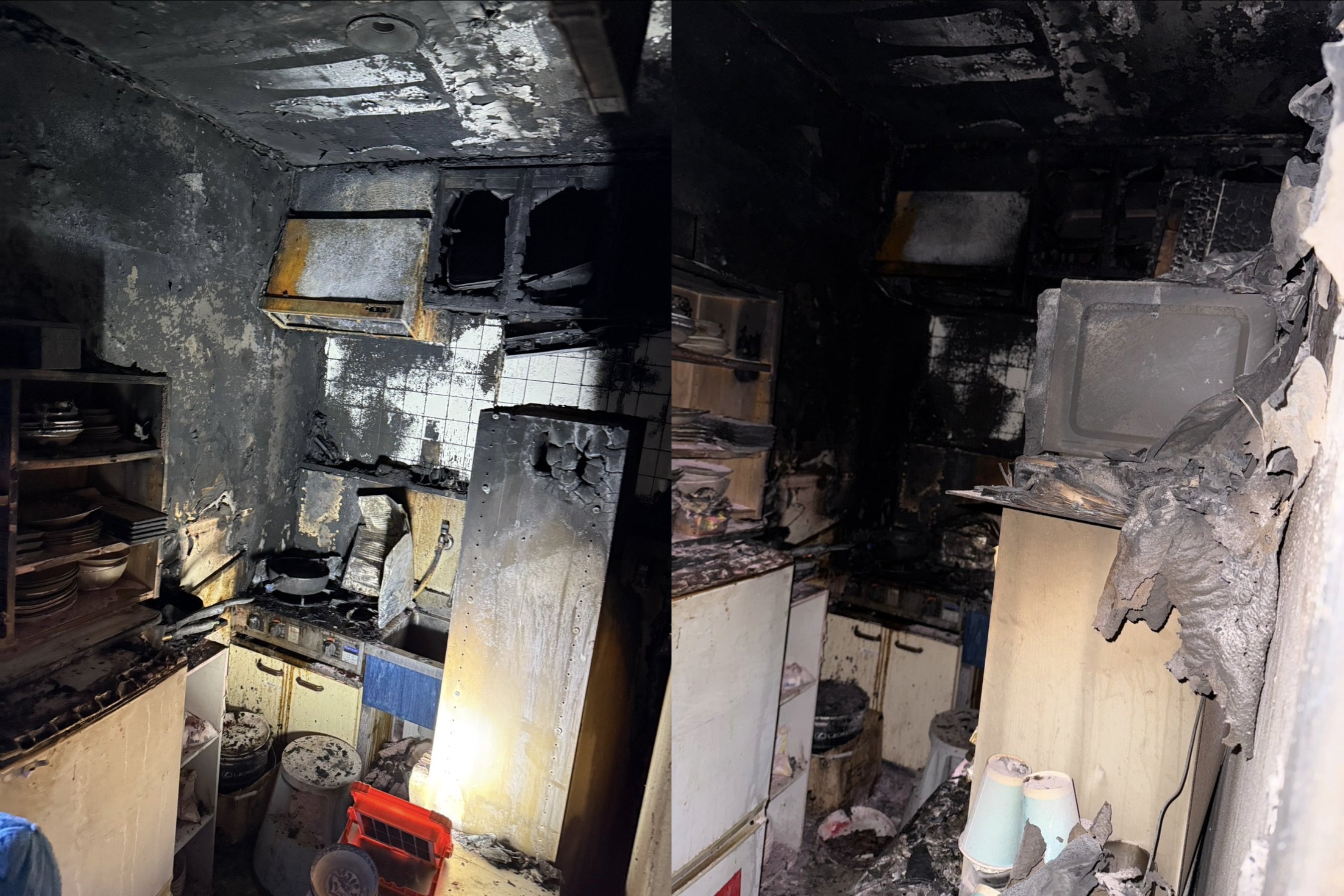 火災発生から消火まで短い時間でしたが、出火元となったお店の裏手にあるキッチンは全焼し真っ黒に焦げている状態で火災の怖さを物語っていました。