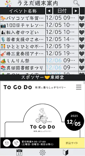 2025/12/05 12:28以前お伝えした通りスポンサー枠とリロード時に各スポンサー様の広告を表示するよう仕様を変更しました。(以下敬称略)[岡崎酒造] https://yanagimachi-ueda.jp/shop/okazaki[こめむすび] https://come-musubi.jp/[地酒屋 宮島] https://mssakaya.com/ [株式会社TEAMMATE] https://www.team-mate.jp/[studio kinenbi] https://kinenbi.studio/[+519worklodge] https://519worklodge.com/[東郷堂] https://www.togodo.co.jp/[間島宣伝事務所] https://msjsenden.com/[地誌と政策を紐解く会] https://geopol.rooz.jp/[クラファン支援者の皆様]表記やWebサイトの変更などは私に連絡頂ければ随時対応致します。広告掲載期間は2026/01/01~2026/12/31となっております。(今月は試用期間というか要望・反応をお聞きする期間にします)次年度以降はまた協賛を募る形で運営費・チラシ作成費の足しにしたいと思っております。ご協力頂けたら嬉しいです。他の報告として、11月は菅平観光組合さまへの告知・チラシ配布や操作説明会の実施を行いました。地道な活動ですが引き続き周知を続けていきます。短いですが今月は年末進行で忙しいので今回はこの辺で。皆様よいお年を! もっと見る