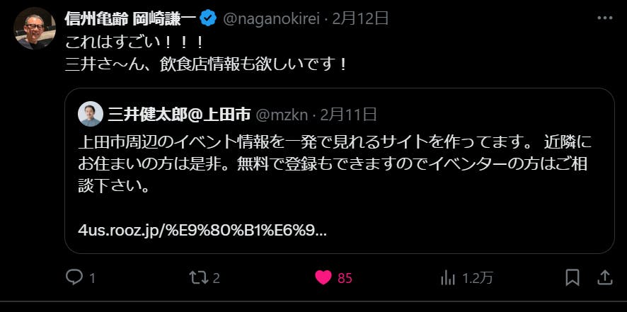 岡崎さんは『うえだ週末案内』が一般公開された直後にSNSで紹介して下さって、最も集客に苦労するハズだった時期に一気にユーザー数を獲得する事ができました。