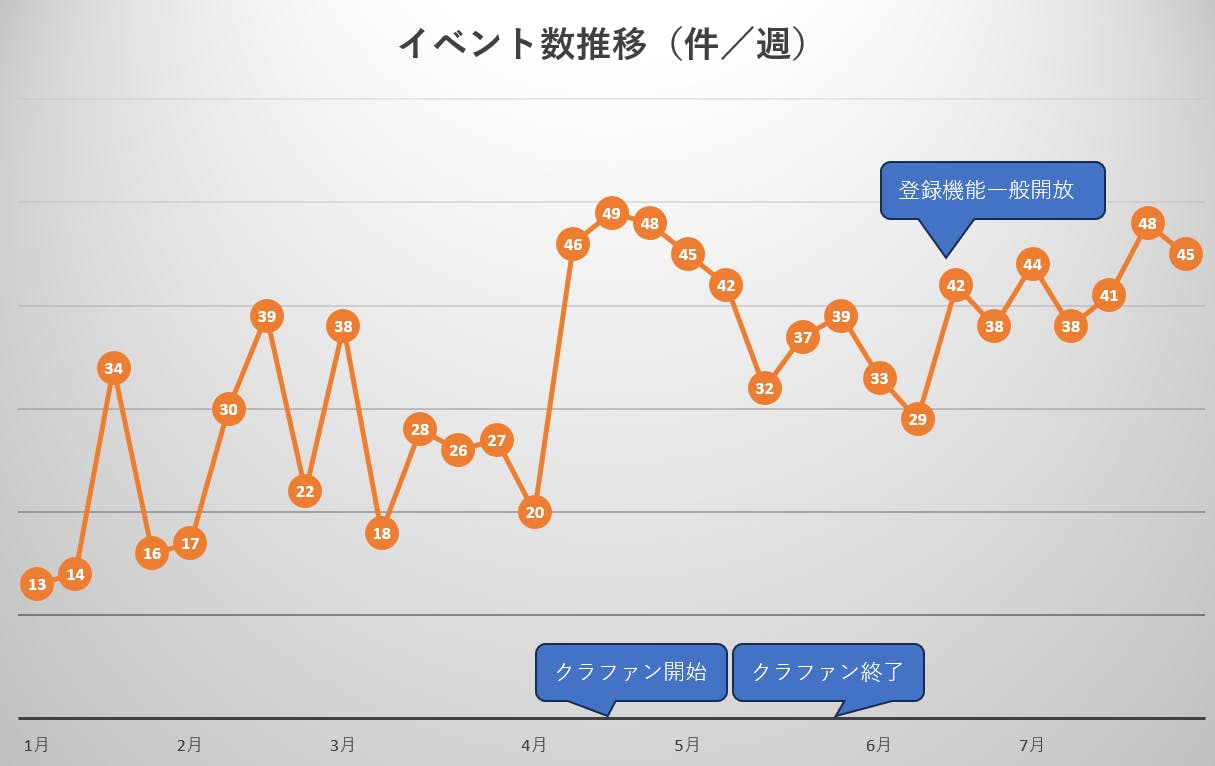 最後にイベント登録数の推移です。冬季は比較的イベントが少ないのを考慮しても明らかに以前よりイベント数が増えてきました。