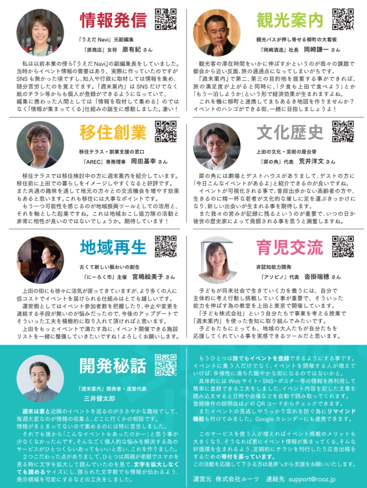 最後に、これはちょっと個人的な報告でもあるのですが、来年3月の上田市市議選に出馬する事にしました。出馬を決めた理由はイベント絡みではなくて、自治会制度の改革が目的なんですけど、選挙戦の中で実績のひとつとして週末案内も紹介していく事になるかなと思います。選挙になると今までリーチしていなかった層にも届くかもしれないので、議員候補としては不純かもしれませんがそっち方向の効果も期待はしています。