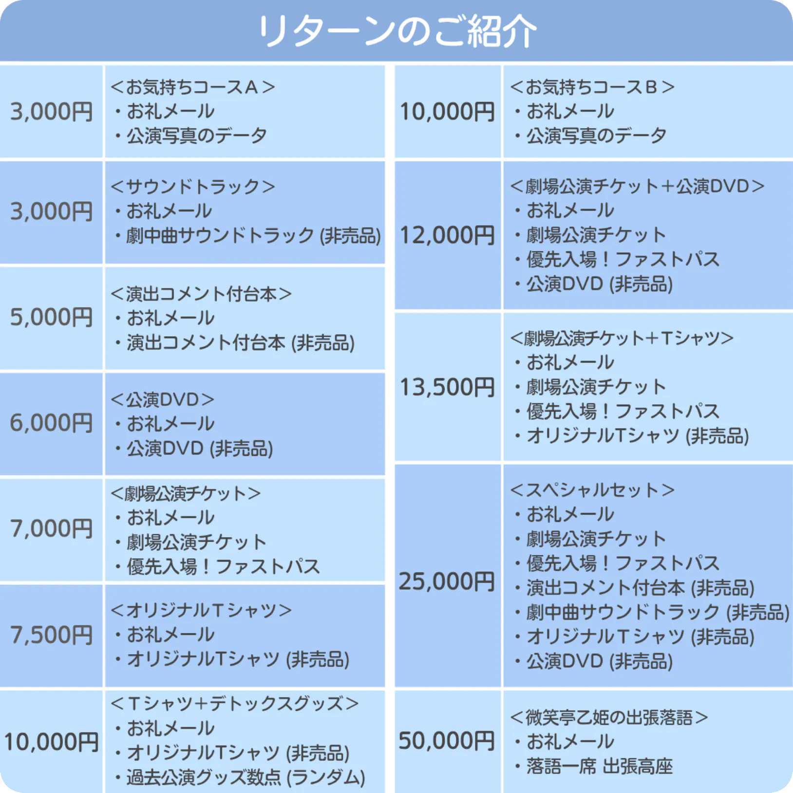 過去公演グッズを「手ぬぐい」「クリアファイル」「ステッカー」「チケットケース」の中からランダムで数点ご提供します。(種類・デザインはお選びいただけません)