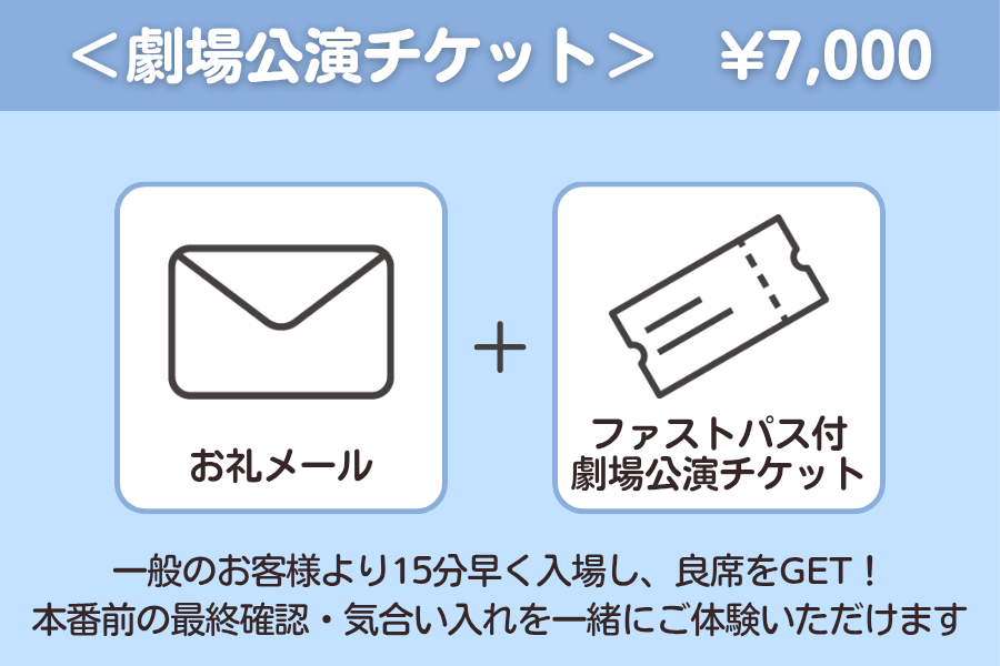 本公演の鑑賞チケットと、一般のお客様より早くご入場いただけるファストパスのセットです。