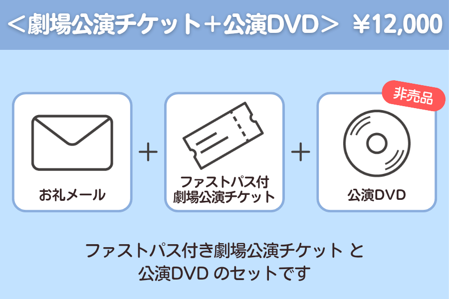 先程ご紹介した、本公演の鑑賞チケット・ファストパスに加え、公演DVDがセットとなったコースです。