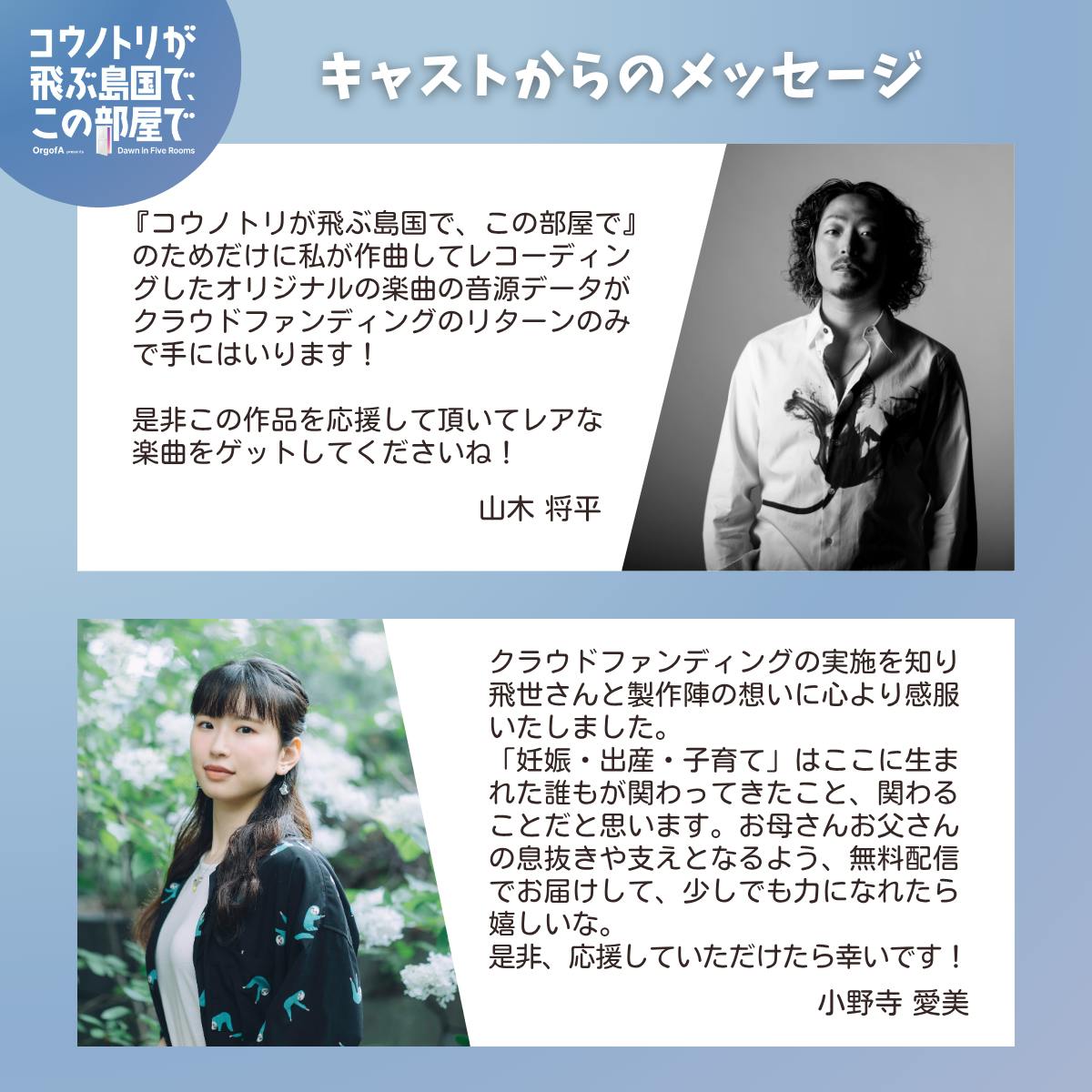 7/4(金)、OrgofAとしては初の試みとなる無料のリーディングイベントを開催しました。OrgofAは、札幌を拠点に活動している演劇企画運営団体です。新作舞台をつくるとき、私たちは作品のテーマはもちろんのこと、「札幌の人々」が日々感じていることや、この地域ならではの空気感を、作品づくりに取り入れたいと思っています。『コウノトリが飛ぶ島国で、この部屋で』という作品は、5つの物語からなるオムニバス形式の舞台です。その中から2つの物語をリーディング用に仕上げ、本公演の俳優たちによる朗読の後、お客様と一緒に座談会を行いました。今回のイベント、結論から言うと「やって良かった!」です。座談会では、お客様ご自身の体験や、周囲の出来事、人から聞いた話など、さまざまなお話をたくさん聞かせていただきました。なかでも印象に残っているのは、「札幌で不妊治療といえば、あの先生!」という共通認識があったこと。こうした話を通して、札幌ならではの地域性がしっかりあるのだと実感しました。また、「妊娠・出産・育児」について、想像以上に多くの憤りや不安、困難があるということ。男性・女性というだけでなく、同性の間でも異なる選択をする人たちへの“理解の壁”がとても厚くなってしまっている現実も見えてきました。もしこのイベントを行っていなければ、きっと出会えなかった瞬間ばかりです。今回のイベントに参加して、たくさんのお話を聞かせてくださった皆さま、この場を借りて心からお礼を申し上げます。本当にありがとうございました!『コウノトリが飛ぶ島国で、この部屋で』良い舞台にしたい。札幌の多くの人々に届けたい。むしろ全国に届けたい!そんな気持ちがメラメラと湧いてきます。メラメラァ!(リーディングイベント・朗読の様子)