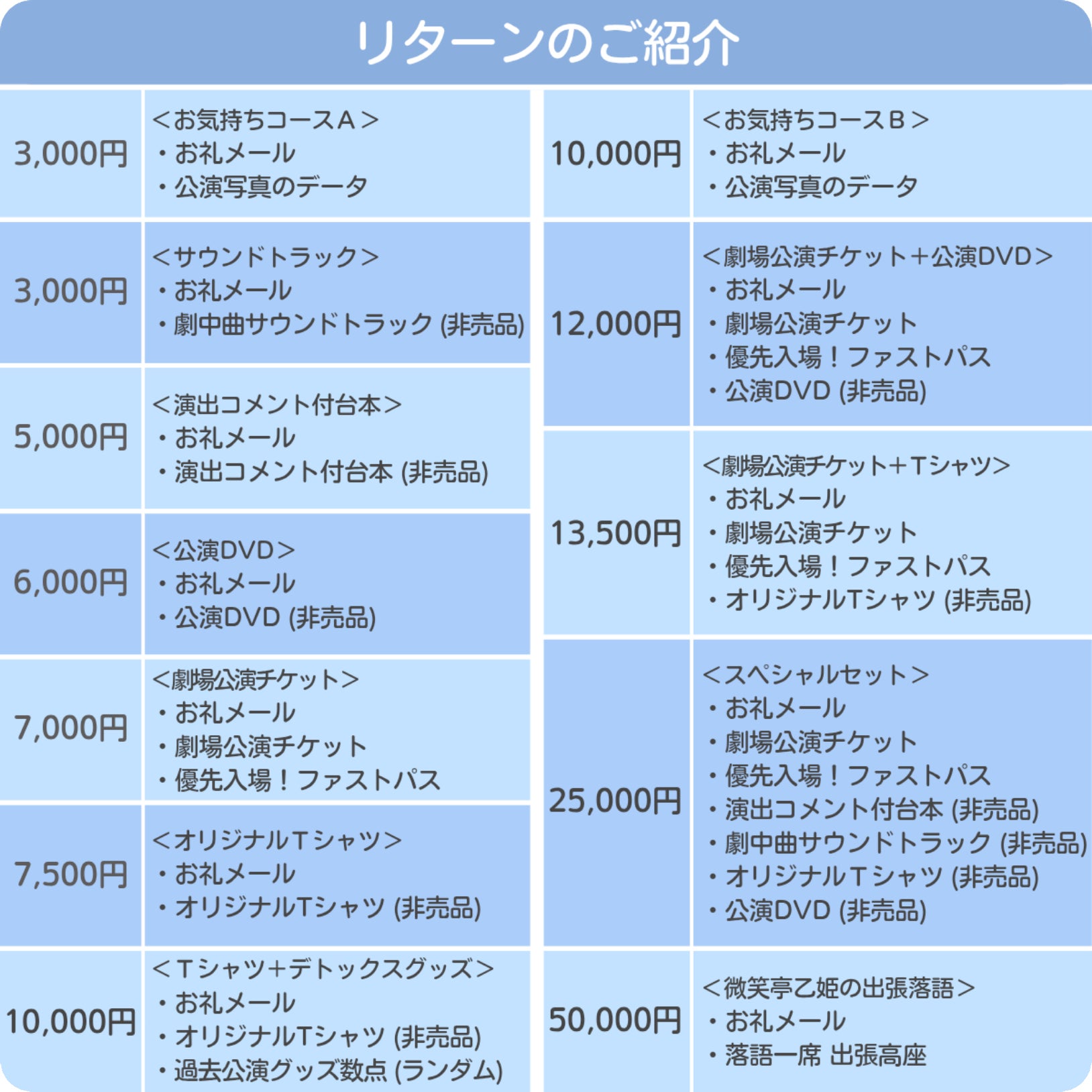 リターンは普段の公演では手に入らないもの、作品をより身近に感じられるものを多数用意いたしました。本公演の鑑賞券付きリターンも用意しています!