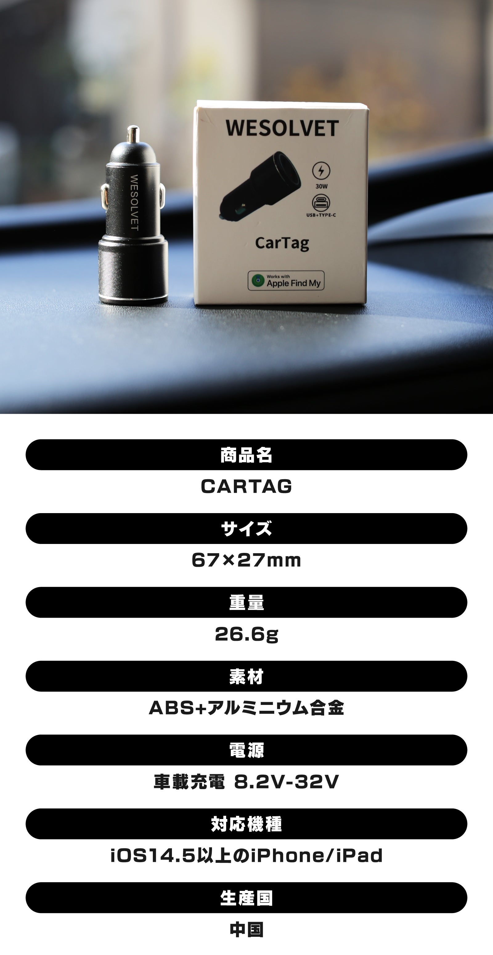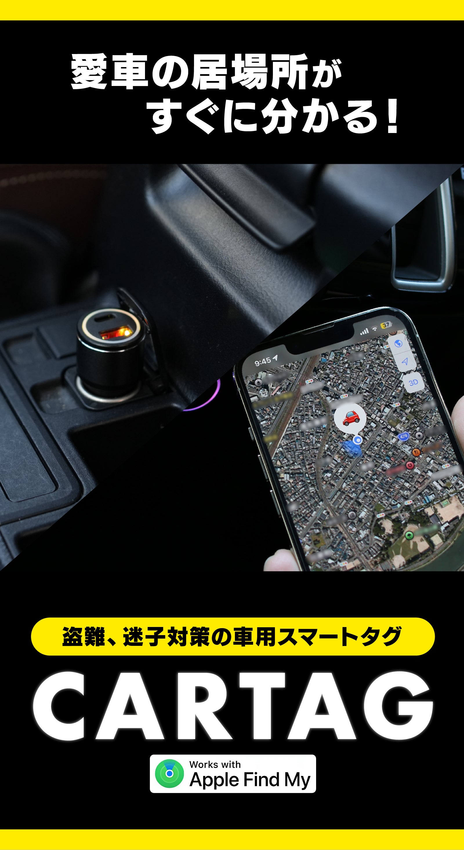 【CARTAG】はシガーソケットプラグ型のスマートタグで、Appleの「探す」アプリを使用することで愛車の位置情報を確認できます。※