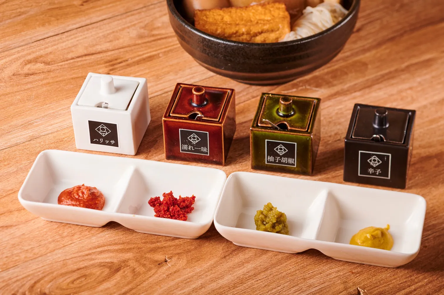 こだわりの卓上の薬味:特製濡れ一味、柚子胡椒、辛子、ハリッサ