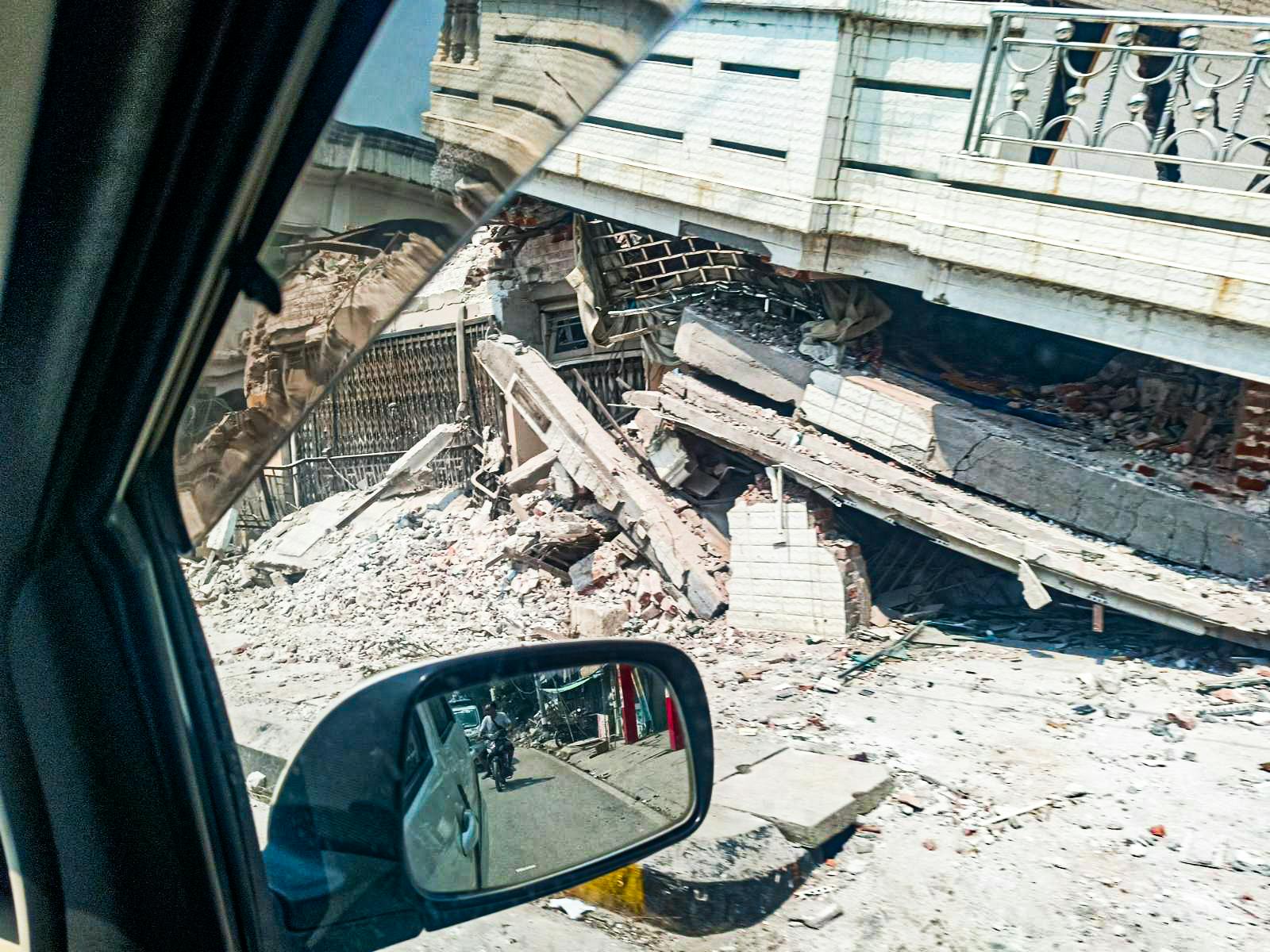 市内の多くの建物は崩壊。住家のほとんども壁などにヒビなどが入り、倒壊する不安から被災者は路上に避難し生活している