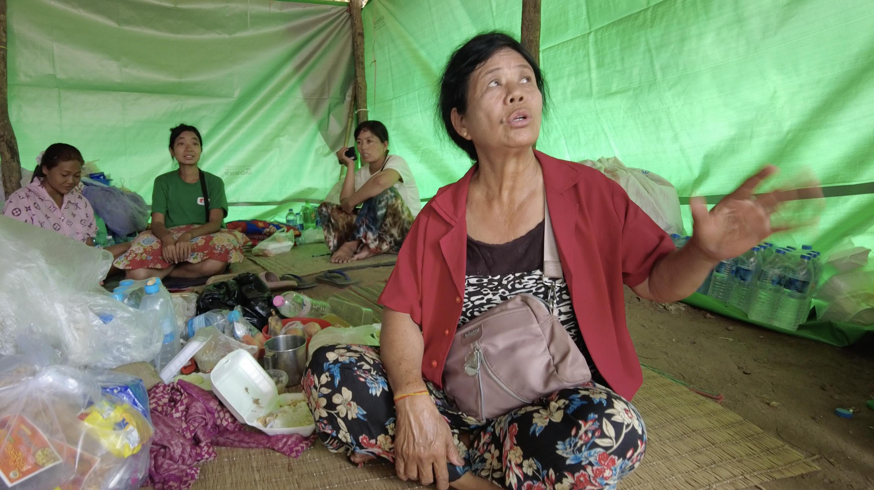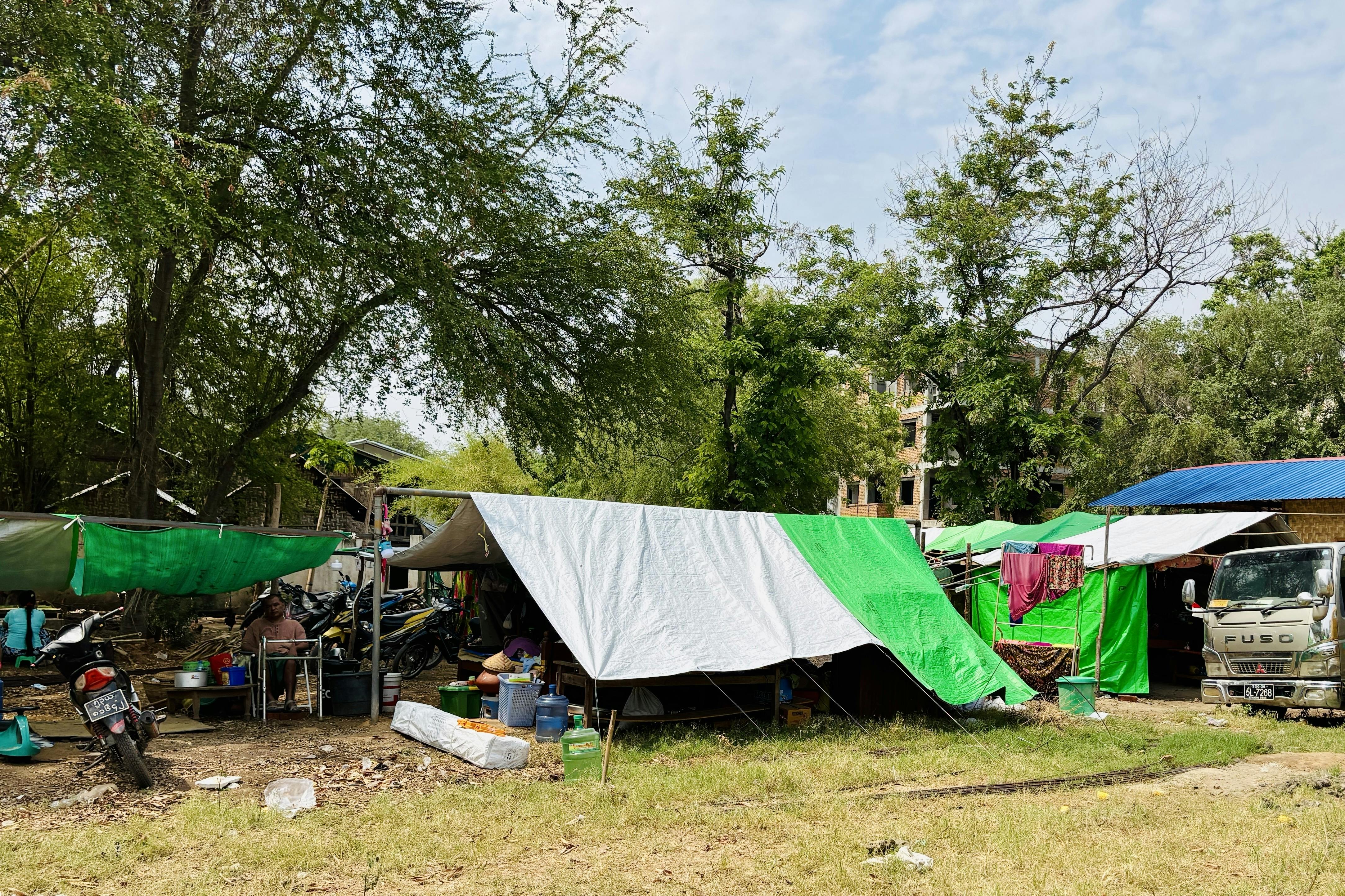 震源にほど近い都市ザガインでは、多くの避難者がお寺や運動場などの場所、あるいは今も道路沿いや壊れた家の前のスペースに自らテントを立てて避難生活を送っています。今回、お寺に避難している40代の女性がお話を聞かせてくれました。