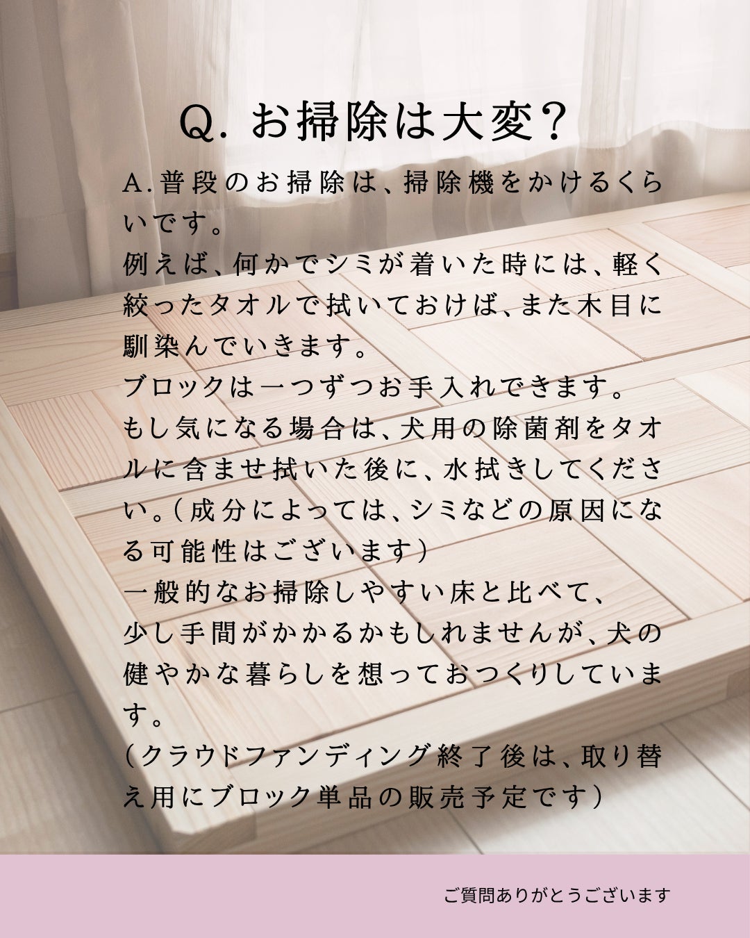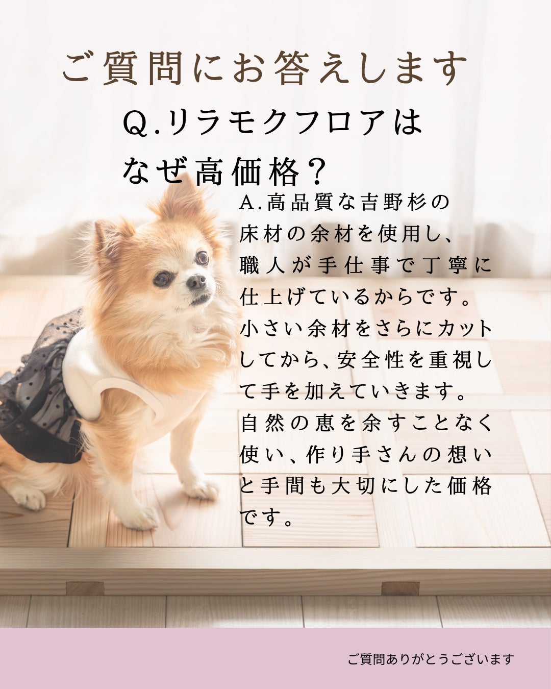 リラモクフロア、モニターさんのご感想です!7週目のモニターさんより(ロングコートチワワ 10歳 チャッピーちゃん)・前からよく寝ていましたが、さらによく寝るようになりました。・下(フロア)からいい空気がいい具合に上がっているのではと思います。・リビングにとても馴染んでいます。・ベランダの出入りに使う窓の下に置いていますが、動いたりしないので安心です。動かしたいときは押せばスッと動かせます。(写真は、リラモクフロアの撮影時うとうとと寝てしまった、モニターでもあるモデルのワンちゃんです。)10周目のモニターさんより (フレンチブルドッグ 4歳 コテツくん)・リラモクフロアの上でよく寝ています。・杉の香りが続いていて、インテリアとしてもとっても素敵!・肌荒れはすぐに完治は難しいと思っていましたが、フロア使用後に一度キレイになりました!でも、その後少しぶつぶつが出てはいるので、このまま気長に様子を見て少しずつ回復に向かえばと思っています。・ワンちゃんだけでなく、人にとってもお勧めです!特にお部屋の環境を変えたい方に!いつのご協力ありがとうございます。6月3日のプロジェクト終了後も、インスタグラムで経過は配信いたします。https://www.instagram.com/ki_to_inu?igsh=MWY5MmVlNHR0azJvZQ%3D%3D&utm_source=qrキトイヌ(こちらは個人の感想です。ワンちゃんによっても違いはあります。)