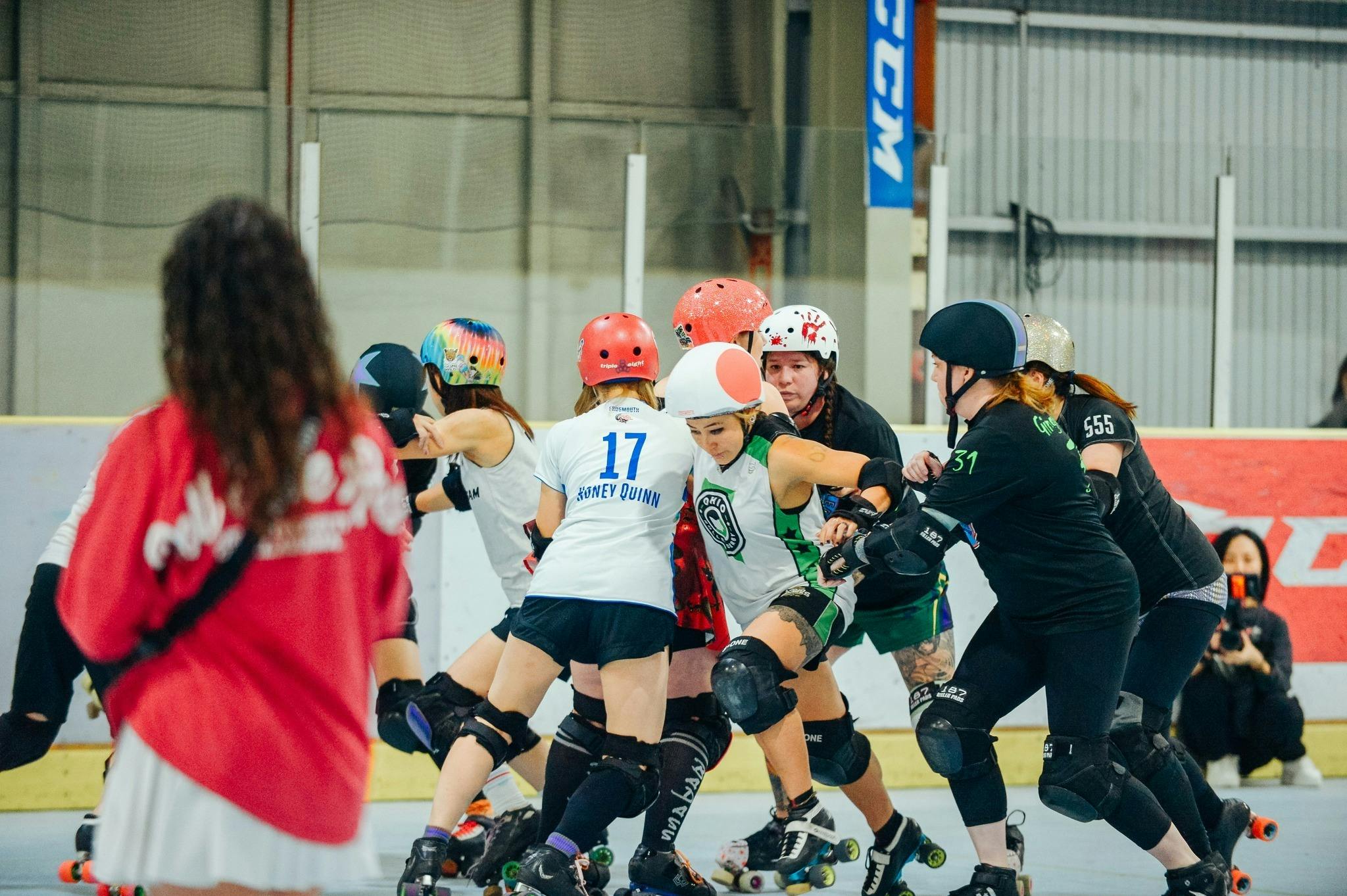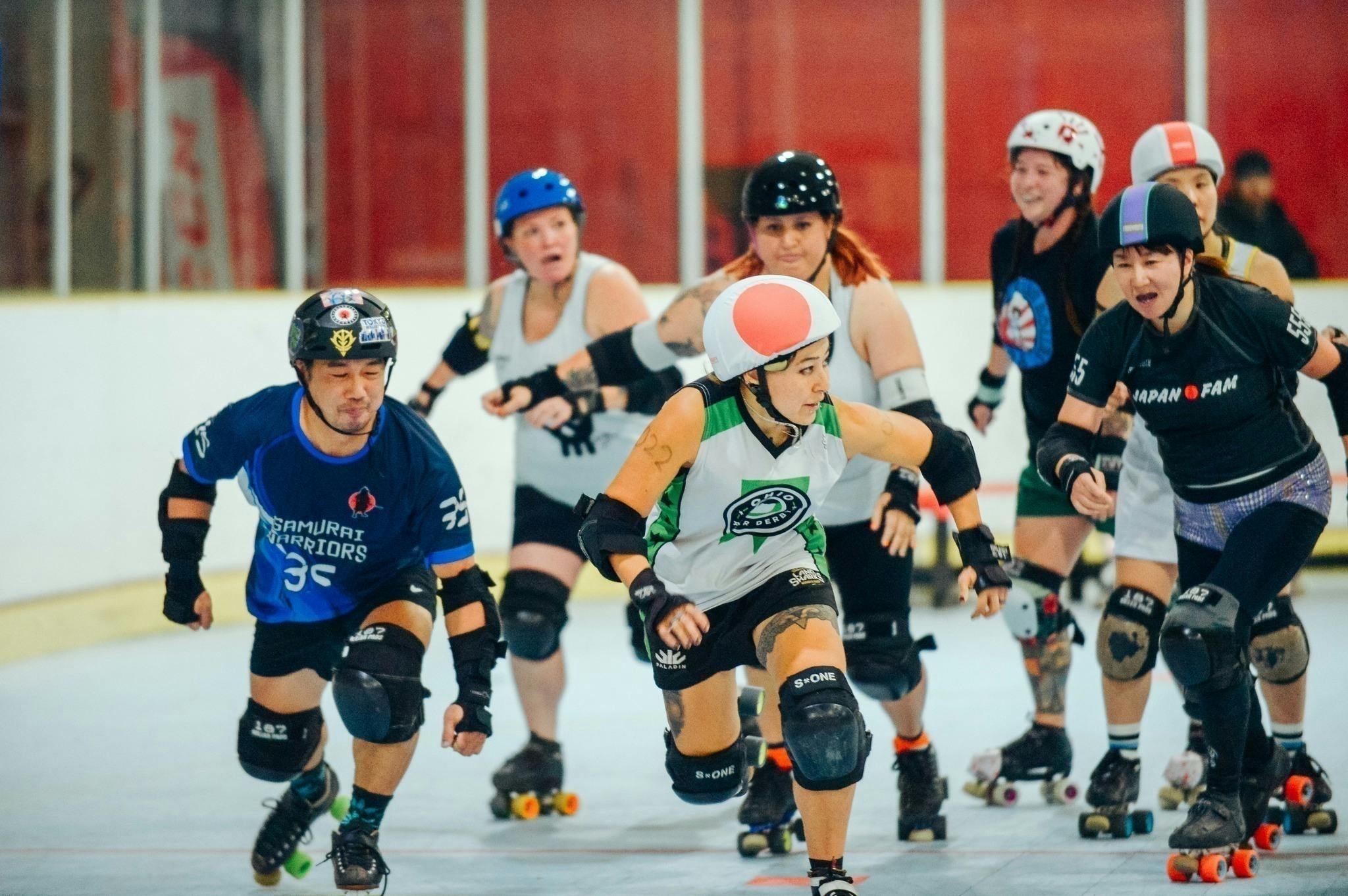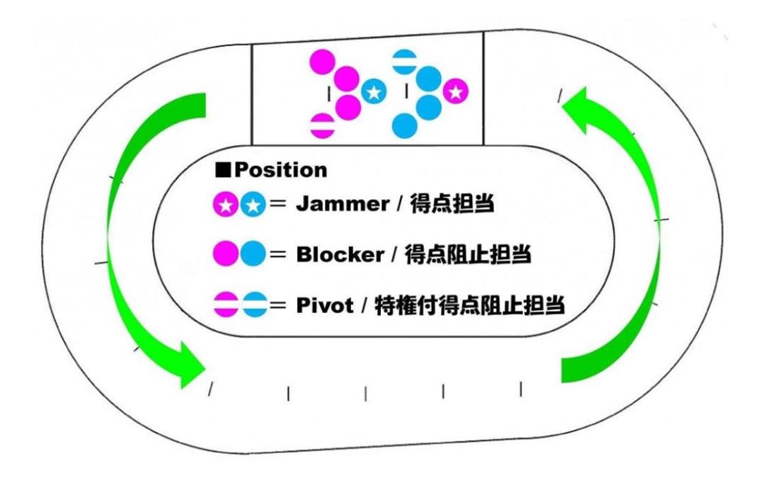 試合形式は、最大5対5の計10名がフラットトラックを滑走しながらスピードとブロック、そしてチームプレーで得点を競い合います。各チーム5名中1名はジャマ―と呼ばれる得点係、残りの4名はブロッカーと呼ばれる得点阻止係に分かれ構成されます。得点方法は、ジャマ―が相手チームのブロッカーを1人追い抜く毎に1点獲得。ブロッカー陣は、相手チームのジャマーに抜かれて得点されないように、ブロックなど様々な攻撃でジャマーの追抜きを阻止します。逆にジャマーは得点する為に、それらの攻撃を交わして突破します。