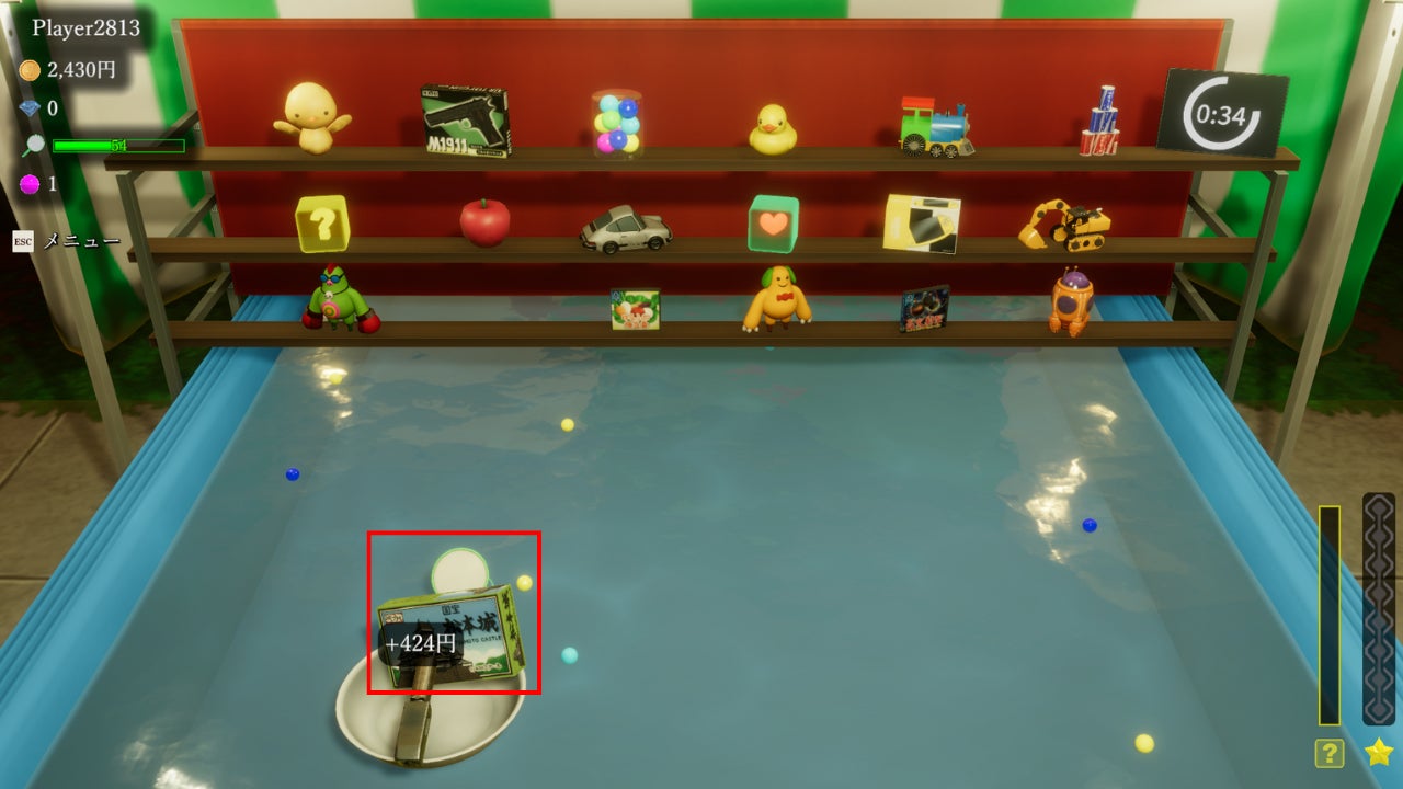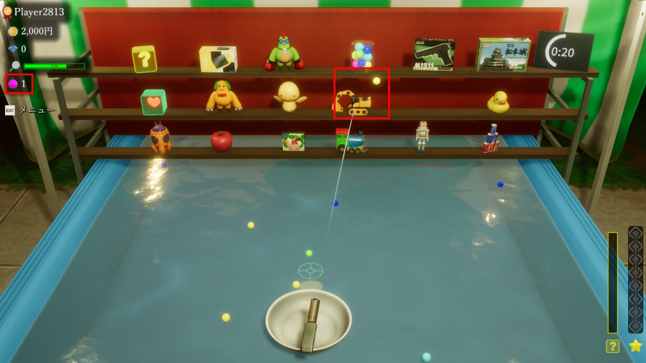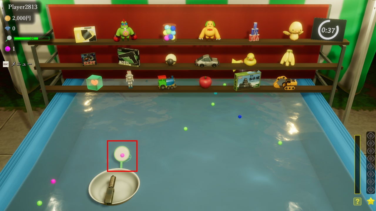 ポイですくったボールは全て射的の残弾になります。シューターを動かして景品を狙いを定めてボールを射出!うまく落とした景品は流れてくるのでポイで上手に景品をすくいましょう。景品をすくえればお金が増えますよ!