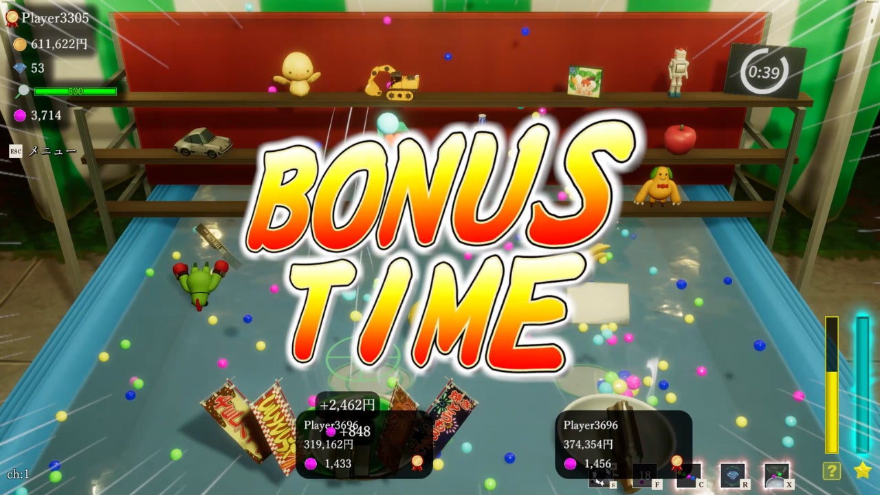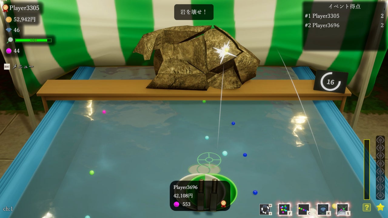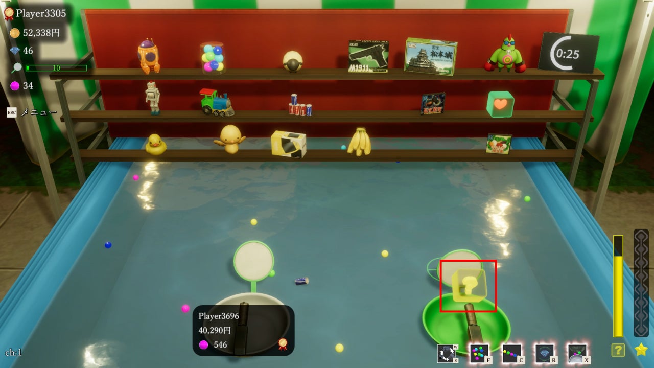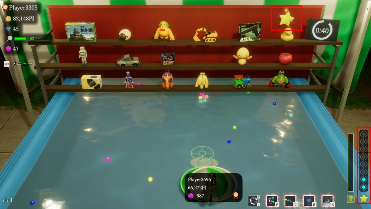 ポイですくったボールは全て射的の残弾になります。シューターを動かして景品を狙いを定めてボールを射出!うまく落とした景品は流れてくるのでポイで上手に景品をすくいましょう。景品をすくえればお金が増えますよ!