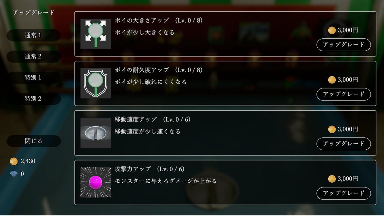 たまったお金をつかってシューターを強化しましょう!ポイを強化するものや景品でもらえるお金を増やすものから、貴重なジェムをつかってシューターにショットガンや連射機能を追加することもできます!