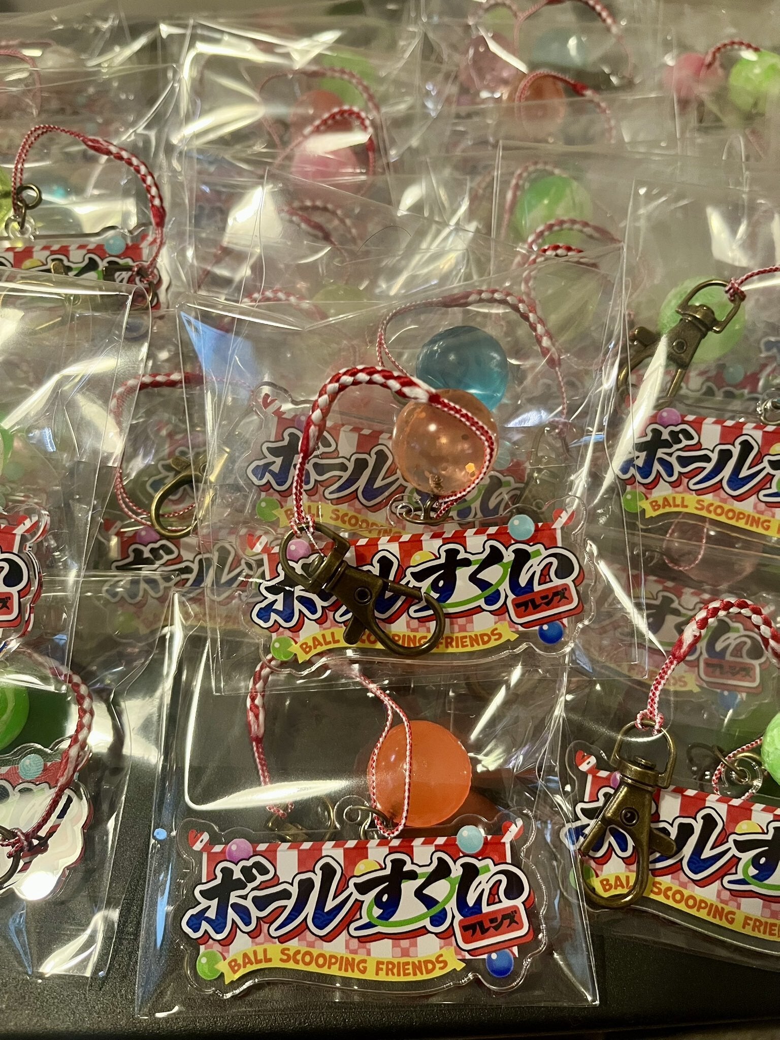オリジナルキーホルダーはボールすくいフレンズのロゴにスーパーボールがついたキーホルダーです。この夏に身に着けて外出したい!夏っぽいアイテムがほしい!皆さんのお供になること間違いなし!