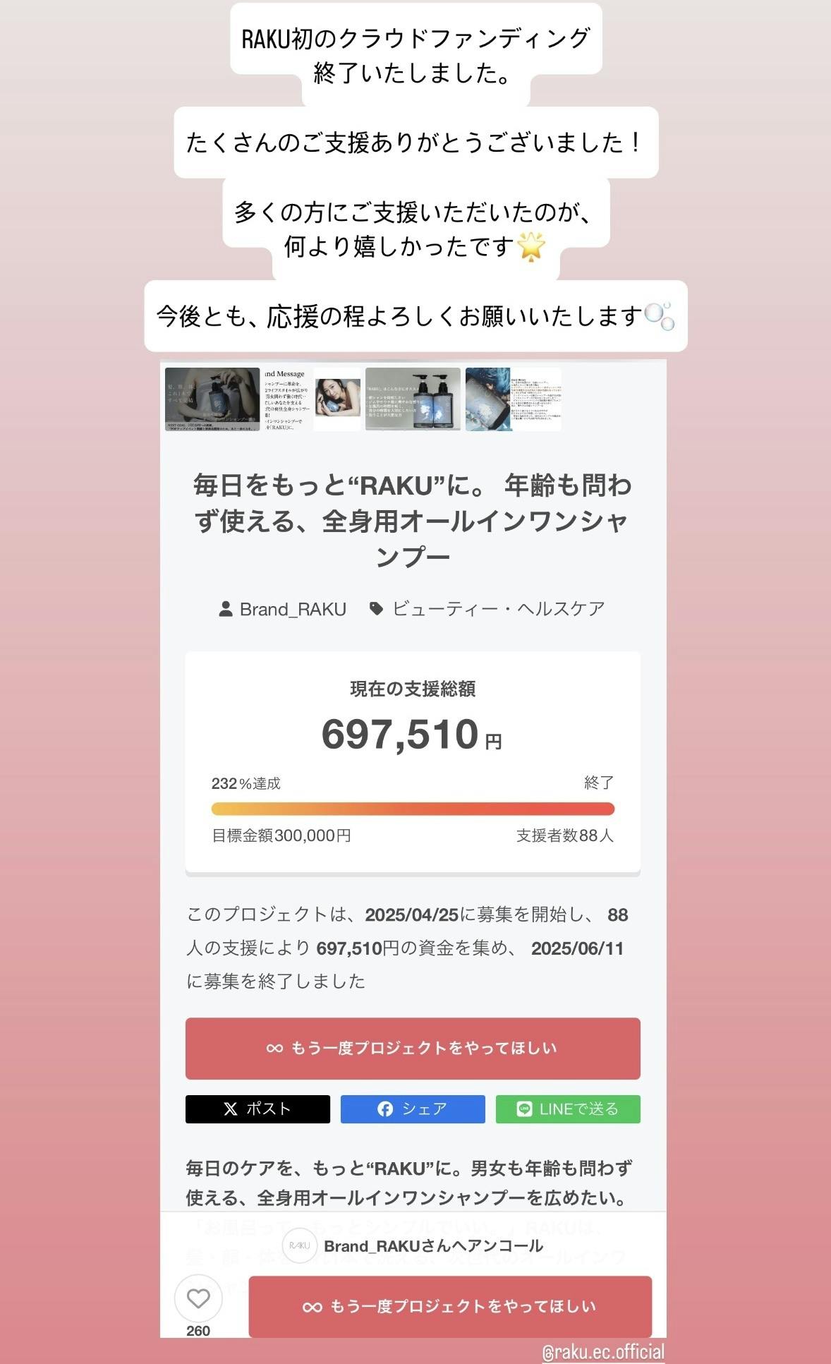 2025/06/12 18:45RAKU初のクラウドファンディング、無事に終了いたしました!たくさんのご支援・応援、本当にありがとうございました。皆さまのおかげで、想いの詰まったRAKUをカタチにすることができました。現在、リターン品の発送準備を進めており、順次発送を開始しております。お手元に届くまで、今しばらくお待ちいただけますと幸いです。引き続き、RAKUをよろしくお願いいたします!RAKU 代表 新井芙和麗 もっと見る