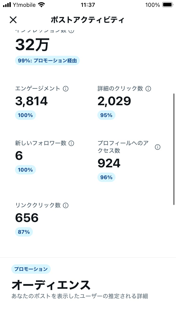 2025/04/07 19:51日々活動皆さん、こんばんは、炭治郎(ペンネーム)です。本プロジェクト実施開始から5日目です。炭治郎のXアカウントにおいて、固定ポストのブーストに広告宣伝費を投入するのも5回以上です。(詳細は後日報告)従って毎日広告宣伝PRの活動をしています。スクリーニング的分析ポストの分析をしていくと先日、皆さんにお伝えしました。本日は、炭治郎の有言実行ということで、スクリーニング的に現段階での大まかな分析を少しだけさせていただきます。下記()内にポストのブーストプロモーションの写真の貢献度の割合(%)を記載して比較していきます。❶インプレッション(99%)❷エンゲージメント(100%)❸詳細のクリック数(95%)❹新しいフォロワー数(100%)❺プロフィールへのアクセス数(96%)❻リンククリック数(87%)分析1上記()内の%からスクリーニングの分析として言えることは、どれも、87%以上ということです。つまり、炭治郎のXアカウントにおける有料のブーストによるプロモーションというか周知には一定の効果がある事実がわかります。ただし、これは5日間だけの統計ですから、サンプル数としては5回以上の有料のブースト実施なので、サンプル数が多い方が説得力があった方がより説得力が増しますね。分析2リンクのクリック数の%が一番少ないんです。つまり、リンクのクリックまでをしてくださっていらっしゃる方のうち、1割程の方は、本件ポストの有料ブーストによる広告宣伝プロモーションをする本件プロジェクト初日以前から炭治郎のことをご存知の方という可能性があるようにも考えることが可能です。スクリーニング分析のまとめつまり、ポスト自体をブーストしてご覧になっていただくユーザー数を増やすプロモーションを意図していた場合においては、「Xの有料ブーストの有効性は高そうだという仮説」を立てて考えることも可能になるかとも思います令和7年4月7日・8日横浜アリーナでのTMNETWORKのライブ公演炭治郎は35年以上にわたり、TMNETWORKのFANKSをしてます。上記ライブチケットは残念ながら...Getできてはおりませんが、当日会場の皆さんは満面の笑顔になってくれること間違い無しと思います。ライブ会場に行かれる皆さんには楽しんできてほしいなと思ってます。活動報告のここまでのご拝読に感謝します。ありがとうございます。 もっと見る活動報告2回目