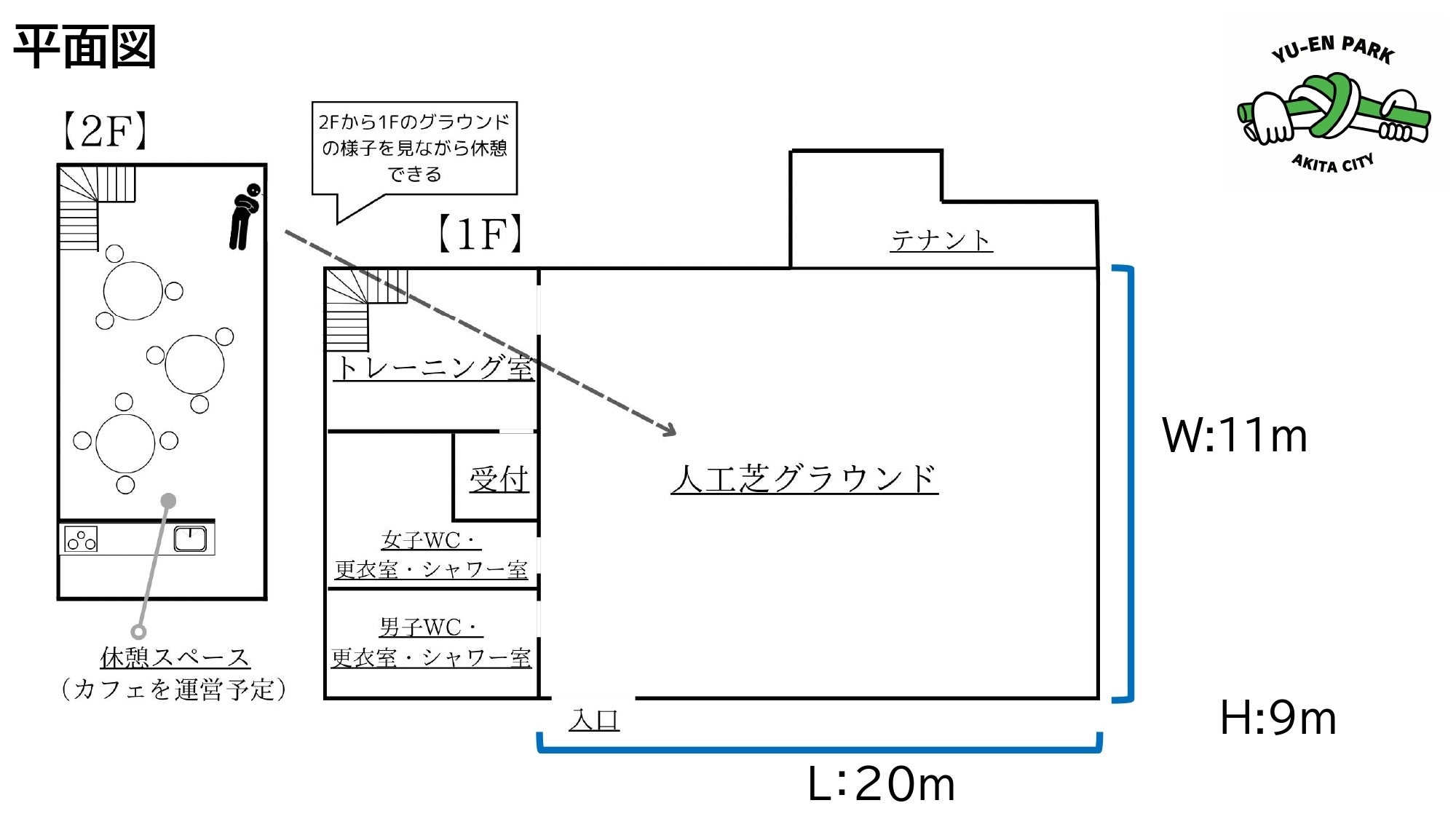 | 設備 | 屋内人工芝グラウンド(ロングパイル人工芝)、男女別トイレ、男女別更衣室、カフェスペース(スポーツ教室開催時の保護者利用、こどもの自学習スペース、打ち合わせなど多用途) |