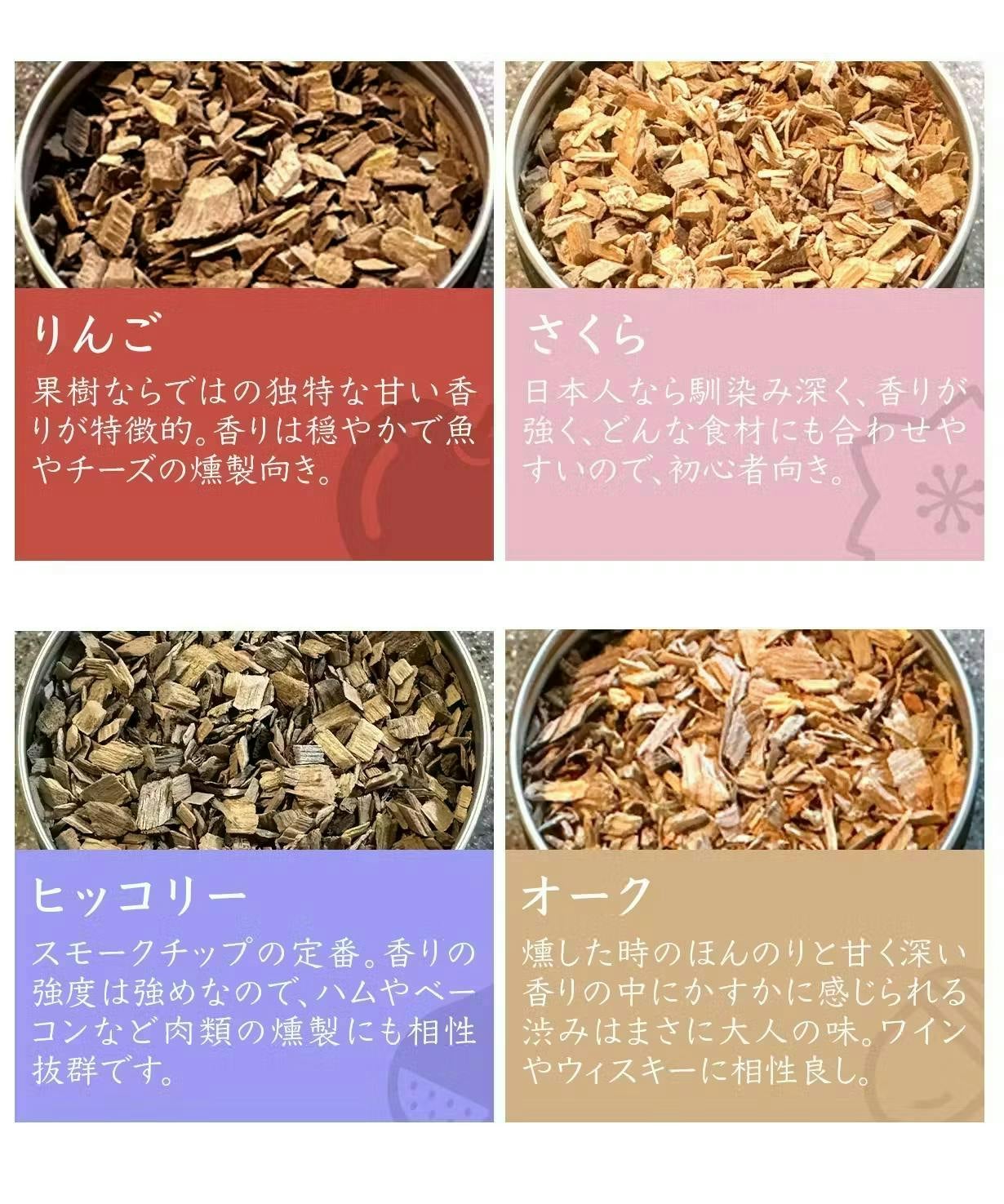 ・木材チップ4種類(りんご、さくら、オーク、ヒッコリー)