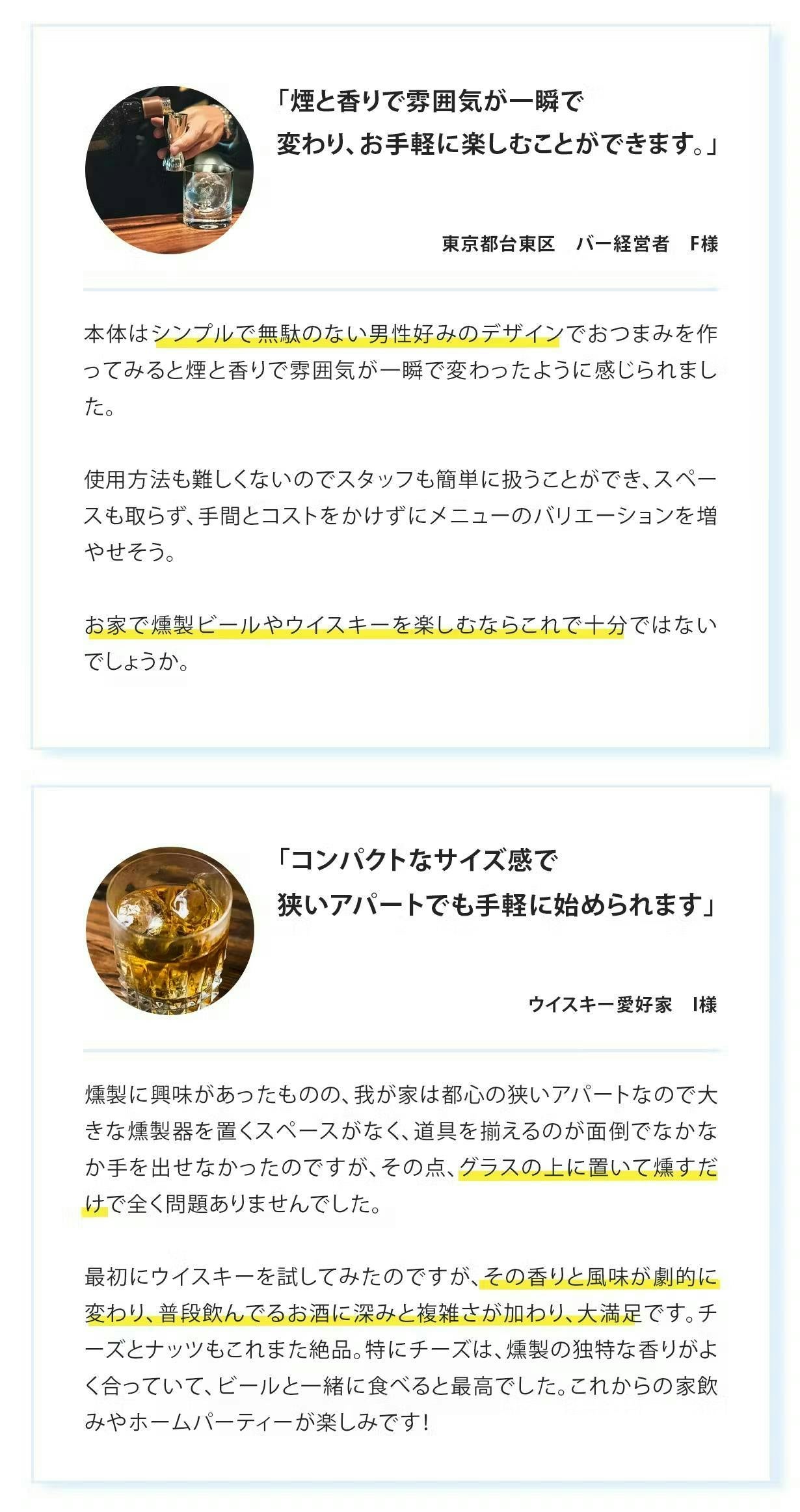 瞬間に広がる香りと煙が立ち昇る演出で嗅覚と視覚を刺激し、燻製による風味と旨味が増すことで「美味しさ」「味わい」をより深く感じることができます。