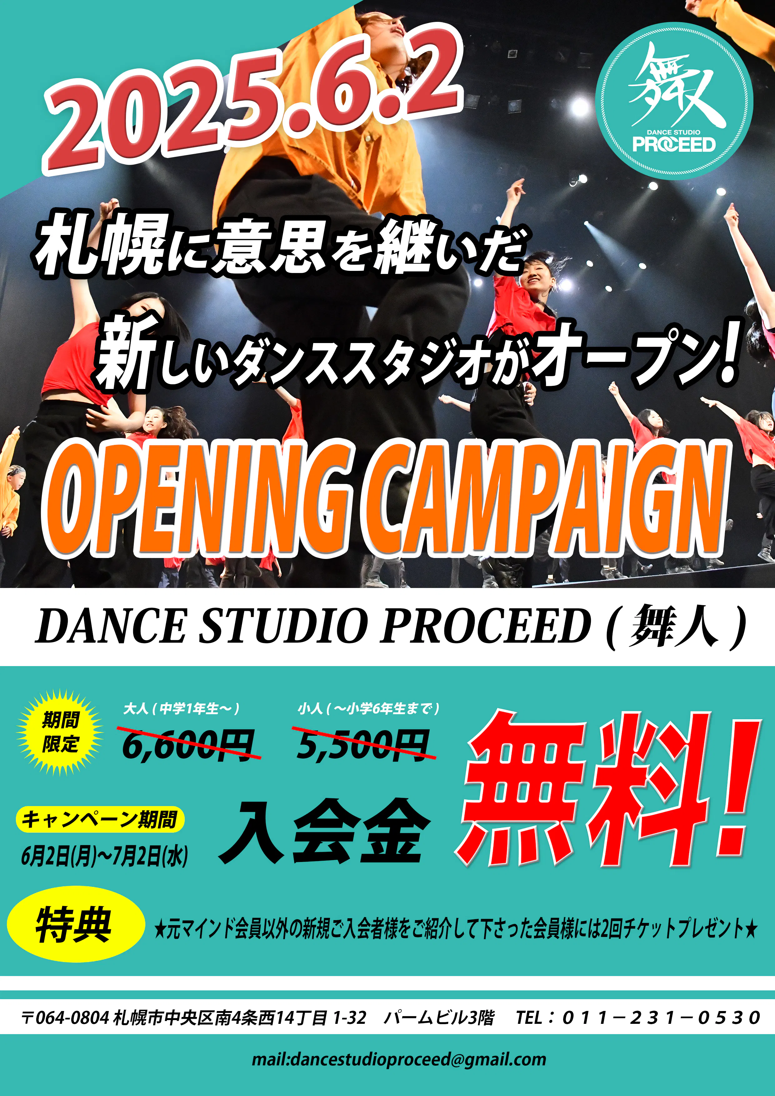 2025/05/20 19:322025.6.2〜7.2 '' オープニングキャンペーン!!''札幌に意思を継いだ新しいダンススタジオがオープン!!ダンススタジオマインドの45年の様々な思いや歴史を引き継ぎ、新たに札幌にオープンしたダンススタジオ!踊りを通して起きていく様々な進化を大切に。そのワクワクを皆様と一緒に感じていきながら、ダンスと音楽の魅力を沢山伝えていきます!------------------------------------新規入会者様も元マインド会員様も誰でも入会金無料‼!!-------------------------------------<キャンペーン期間>2025年6月2日(月)〜7月2日(水)<キャンペーン特典>①大人(中学生以上)→入会金通常6,600円が誰でも無料!ジュニア(小学生以下)→入会金通常5,500円が誰でも無料!②元マインド会員以外の新規ご入会者様を紹介して下さった会員様には2回チケットプレゼント!<WEB入会方法>WEBからの事前申し込みで簡単手続き!画像のQRコードより申し込みいただけます。登録完了メールが届いたら入会完了です。<決済方法>各種サービスに対応!カード決済、電子マネー・スマホ決済、QRコード決済にも対応!お得なキャンペーンです!!たくさんのご入会お待ちしています!!--------------------------------------お問い合わせ/ DANCE STUDIO PROCEED (舞人)〒064-0804 北海道札幌市中央区南4条西14丁目1−32 札幌パームビル 3FTEL:011-231-0530mail : dancestudioproceed@gmail.com#dancestudioproceed #dance #sapporodance #sapporo #junior #kids#入会金無料キャンペーン #無料 #入会キャンペーン#ダンススタジオプロシード#キッズダンス #キッズダンススクール #キッズダンスレッスン #キッズダンススタジオ#札幌ダンス #札幌ダンススタジオ#札幌ダンスレッスン #札幌ダンス教室#札幌習い事 #札幌ダンススクール#札幌ダンス体験 もっと見るタイムテーブル発表!!
