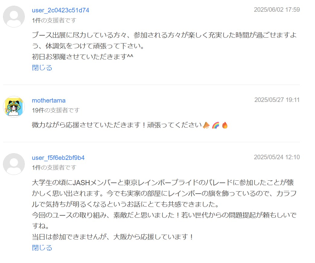 おはようございます!JASH副代表いのまた(かな)です。ご支援ありがとうございます。28名の方にご支援いただきました!支援者の方かたメッセージをお寄せいただいています。画像は一部ですが、皆さんの応援メッセージがとても嬉しいです。さて、いよいよ東京プライドが今日、明日開催されます。JASHのブースはBlue39番ですよ~!ユースメンバー、代表あみちえに会いにきてください。東京プライドの詳細はこちらをご覧ください。楽しみ方も様々です。https://pride.tokyo/JASHでは8日にAll Sexuality交流会を12時から開催します。終了後に参加者でブースを見て回ったり、パレードを応援したりできます。まだお申込み受け付けています。https://peatix.com/event/4395425カラフルな二日間になりますように!