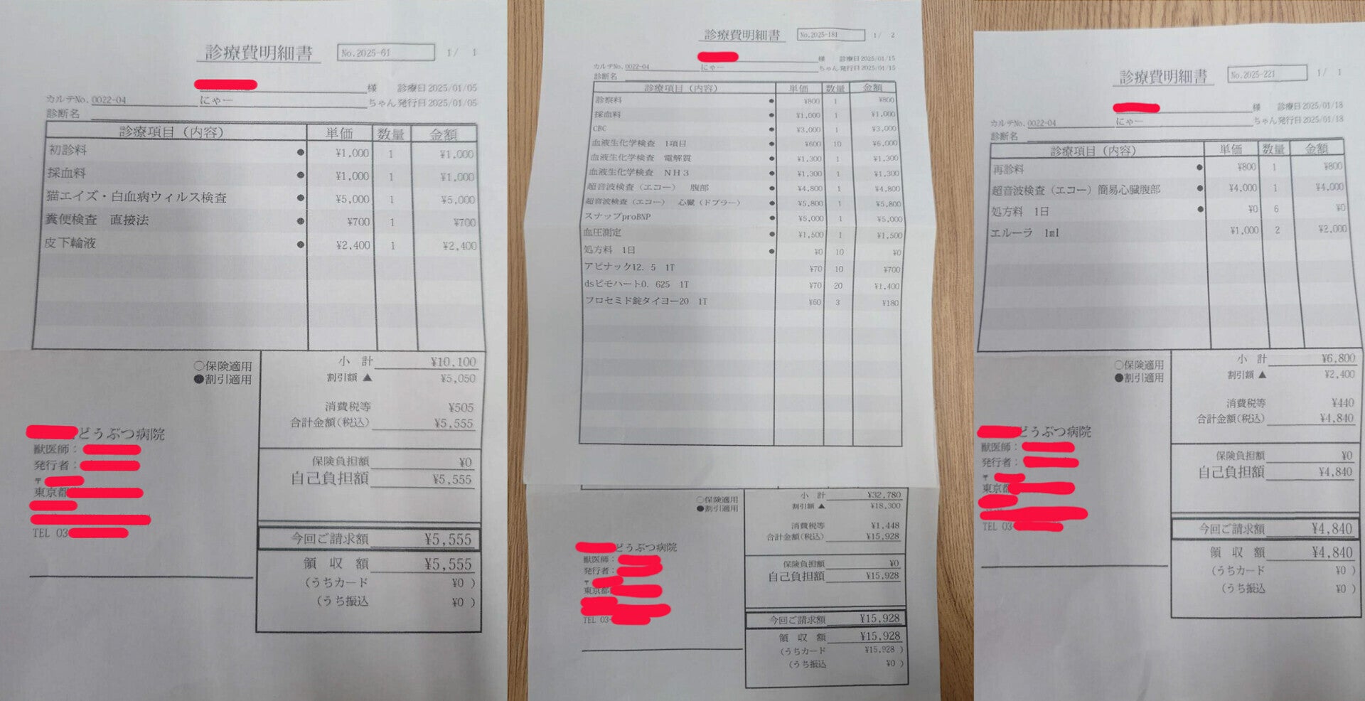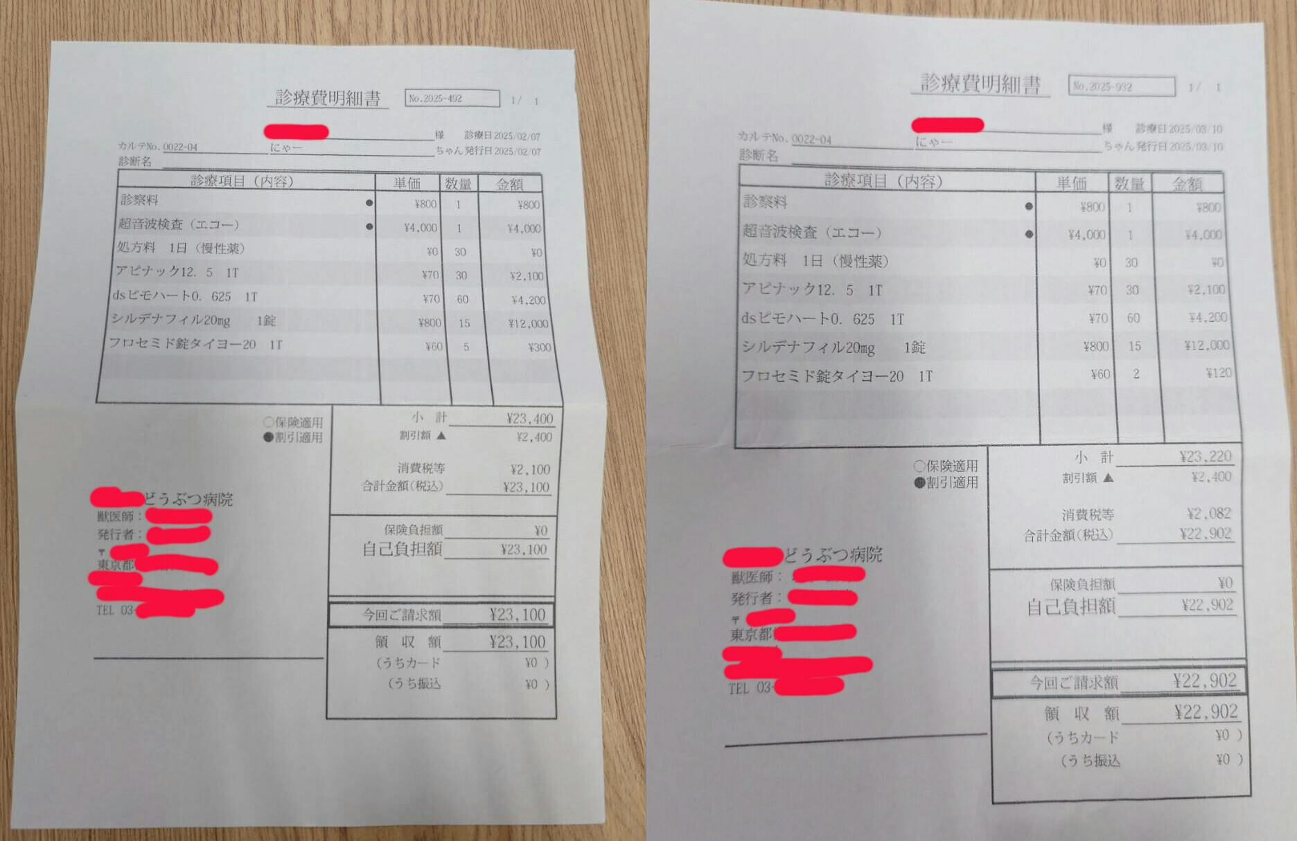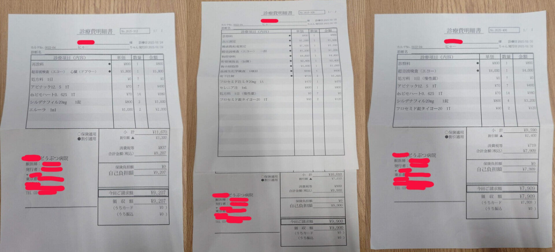 1か月の薬代と通院費、エコーなど含め約15,000~25,000円