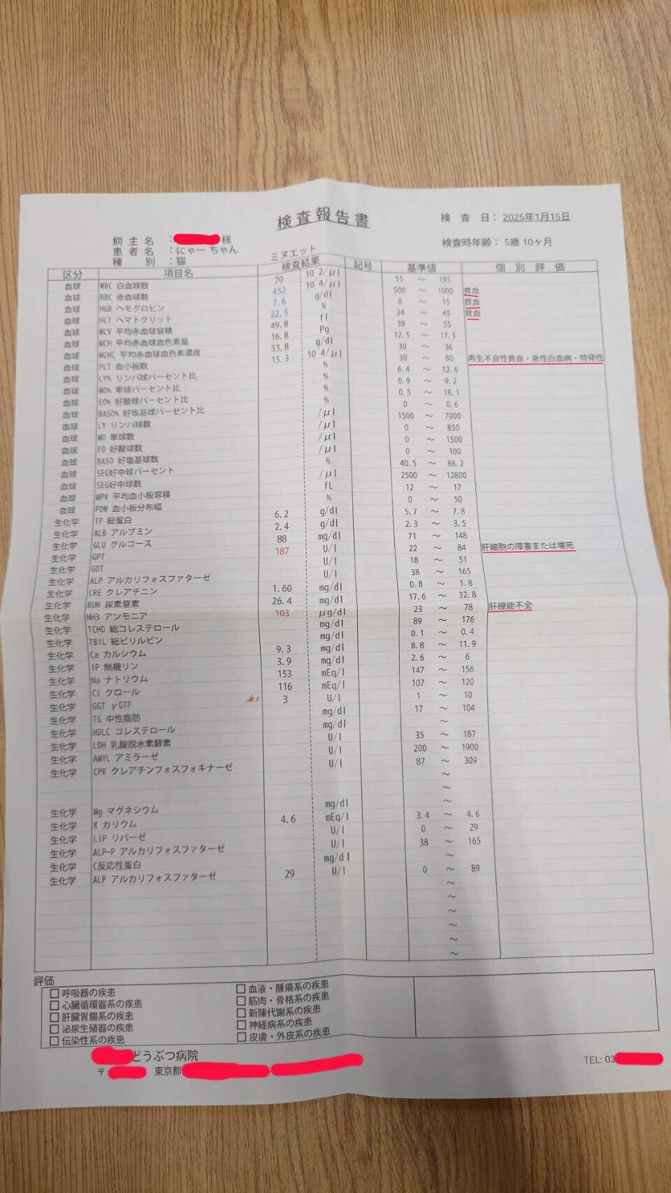1月末に猫の呼吸が荒く、食欲もなくなり生命力が無くなってきた。