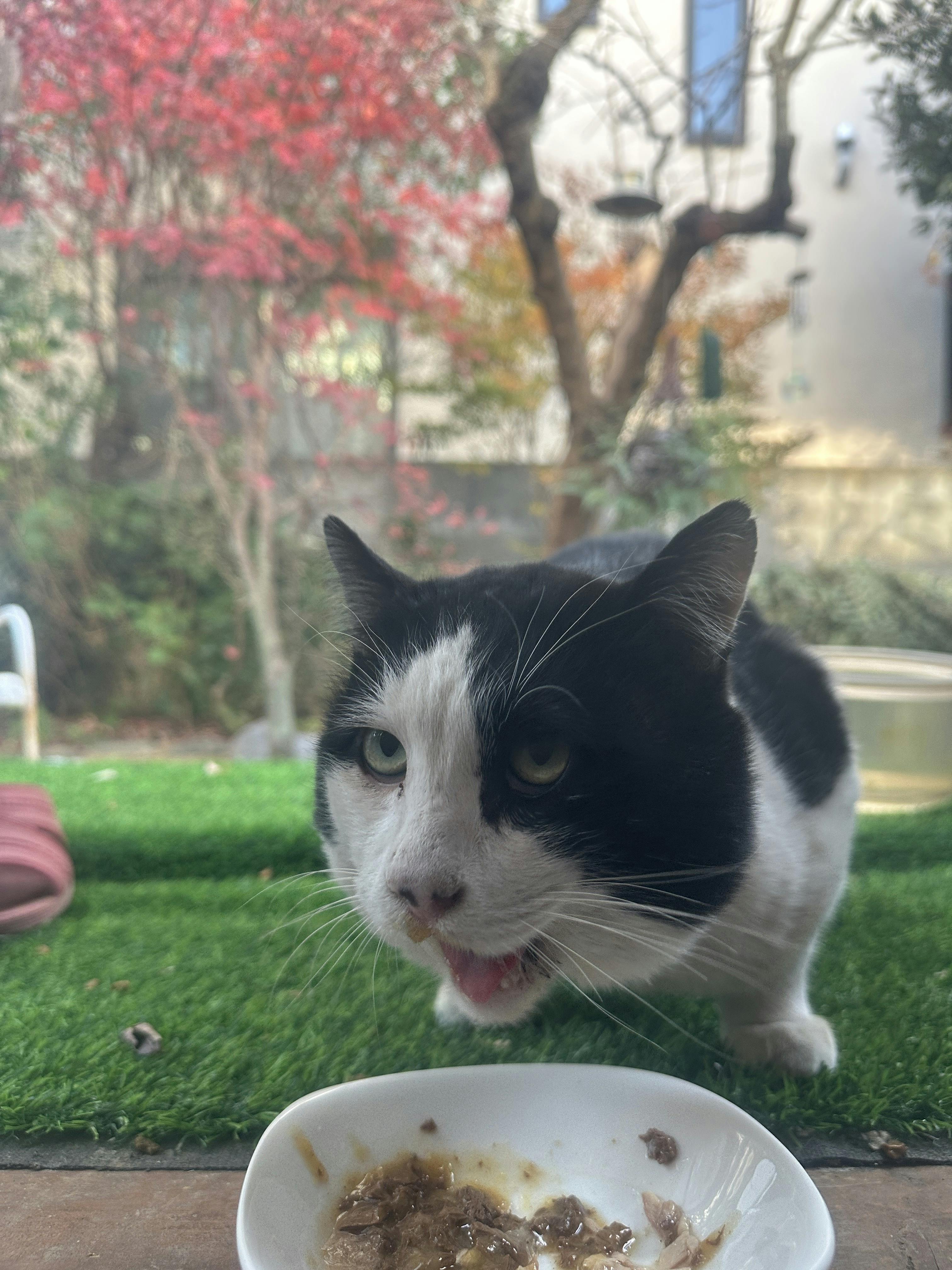 庭に通うこの猫はだいぶ慣れてきたようですが、なかなか警戒心が強いです
