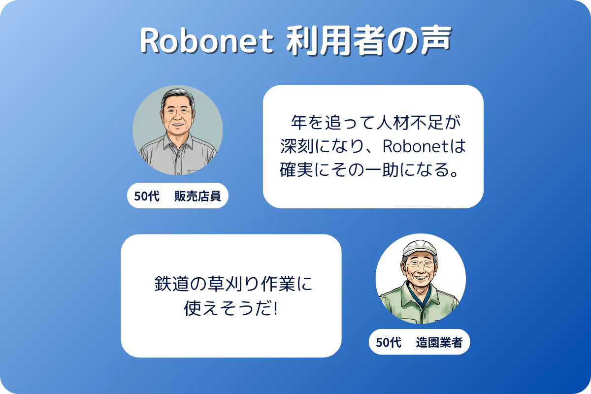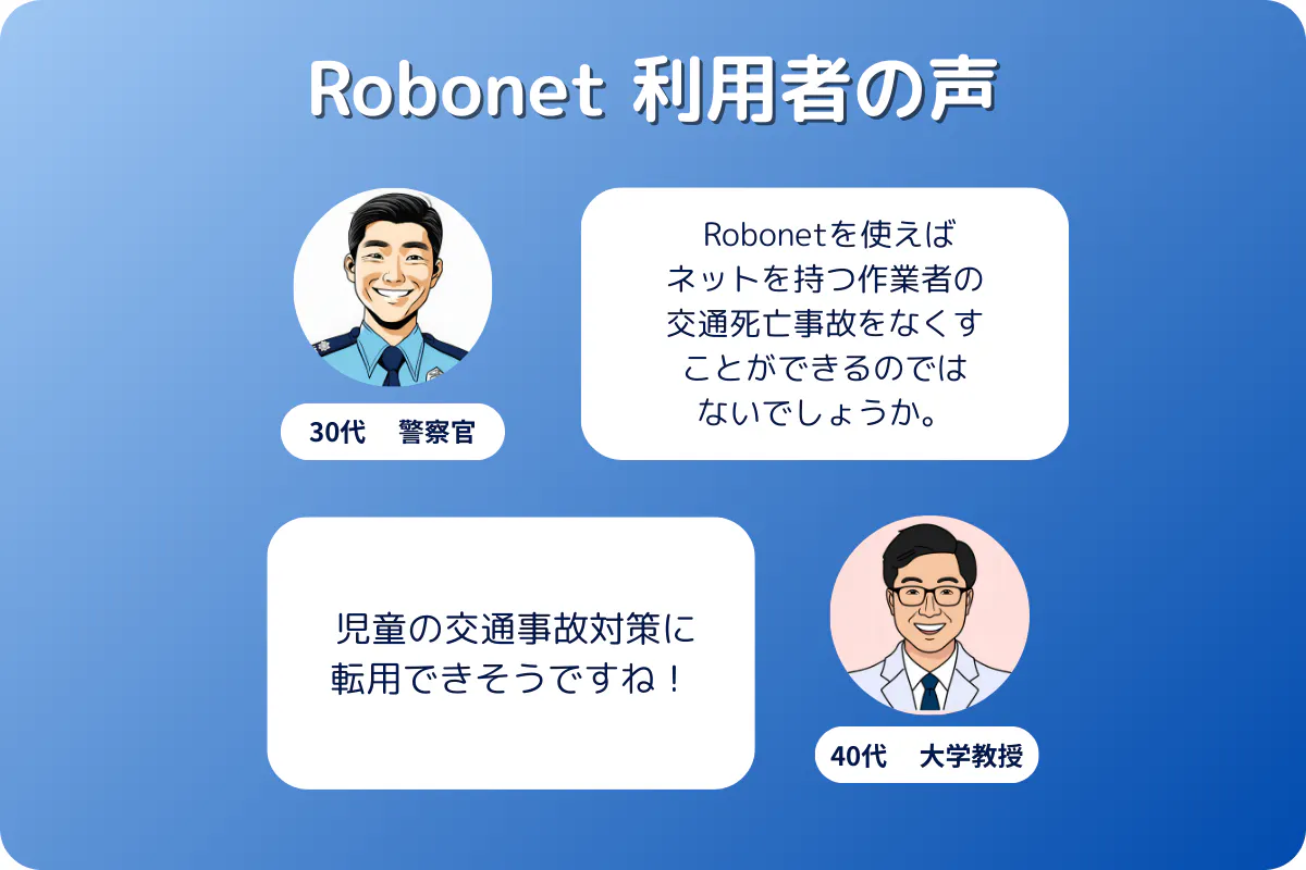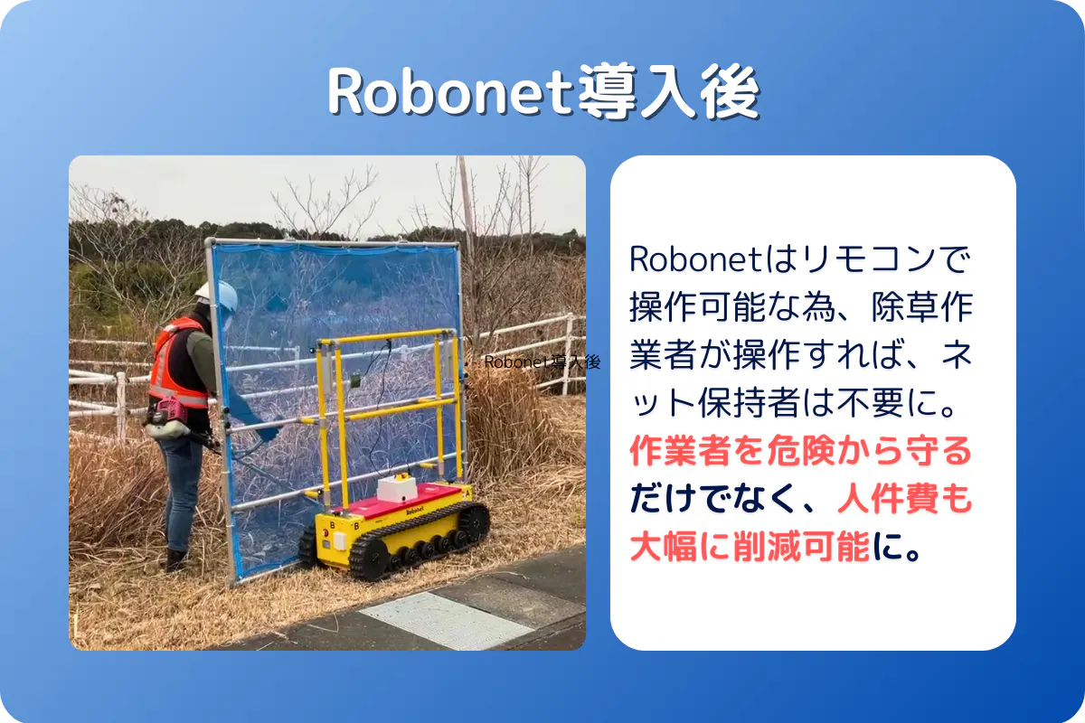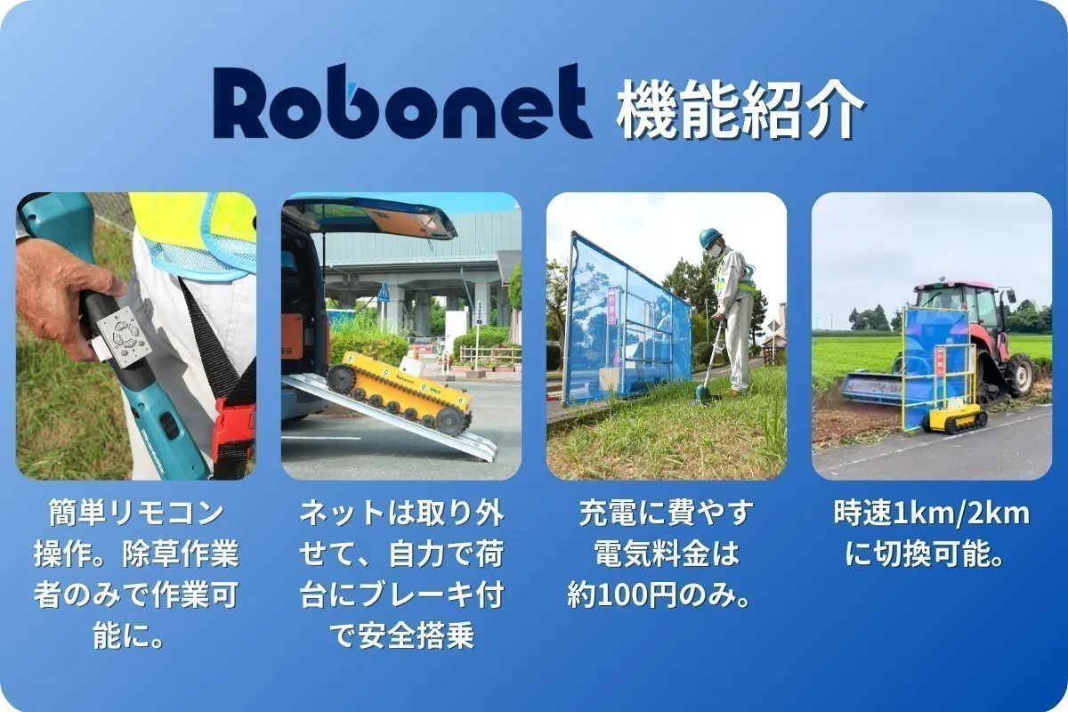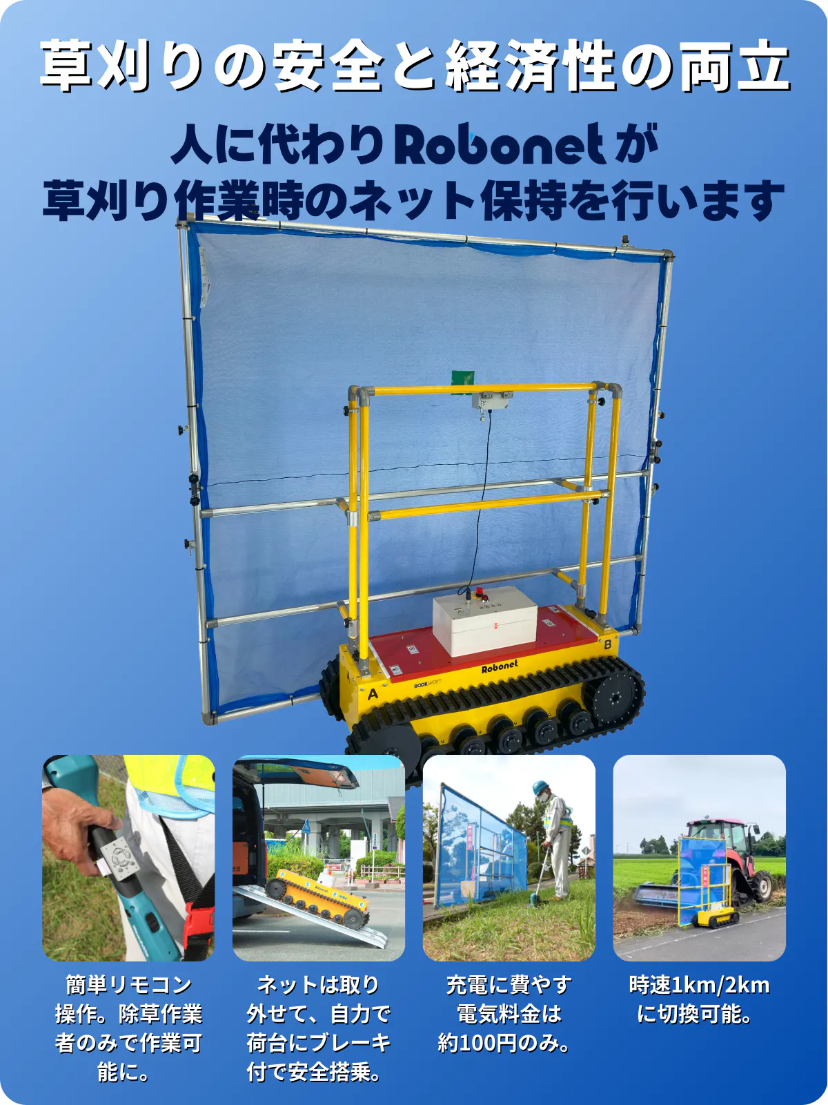 Robonetの開発には、モニタテストに協力頂いた業者様、特許申請、商標登録にご協力を頂いた自治体様、警察庁・国交省のご担当者様からのご指導、販売店様から助言を頂き、完成することができました。Robonetが草刈り作業の必需品となり、町で普通に見掛けられるようになること、そして交通事故や熱中症被害が少しでも減ることを願います。