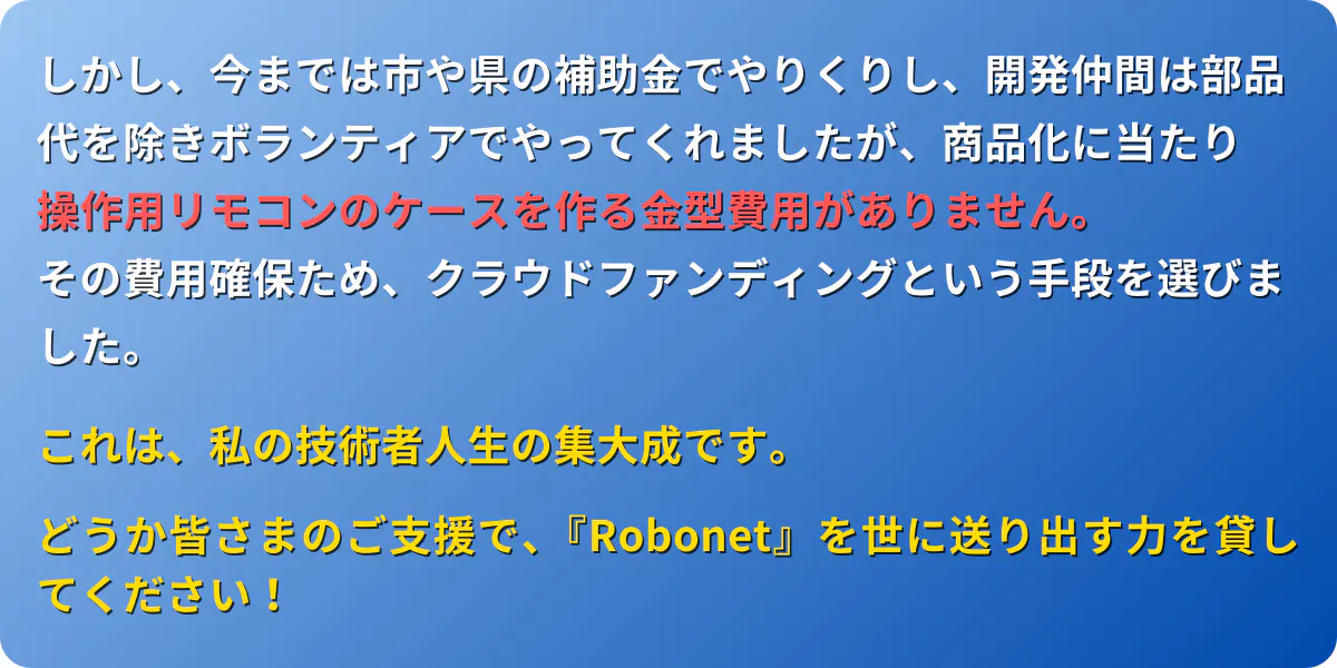 今まで自己資金と市や県の補助金でやりくりをしており、開発仲間も部品代を除きボランティアでやってくれています。しかし、商品化に当たり操作用リモコンのケースを作る金型費用が足りない為、皆様にお力添えをいただきたいと思っています。リターンとして、お礼のメッセージと今後の活動報告をメールにてお送りさせて頂きます。