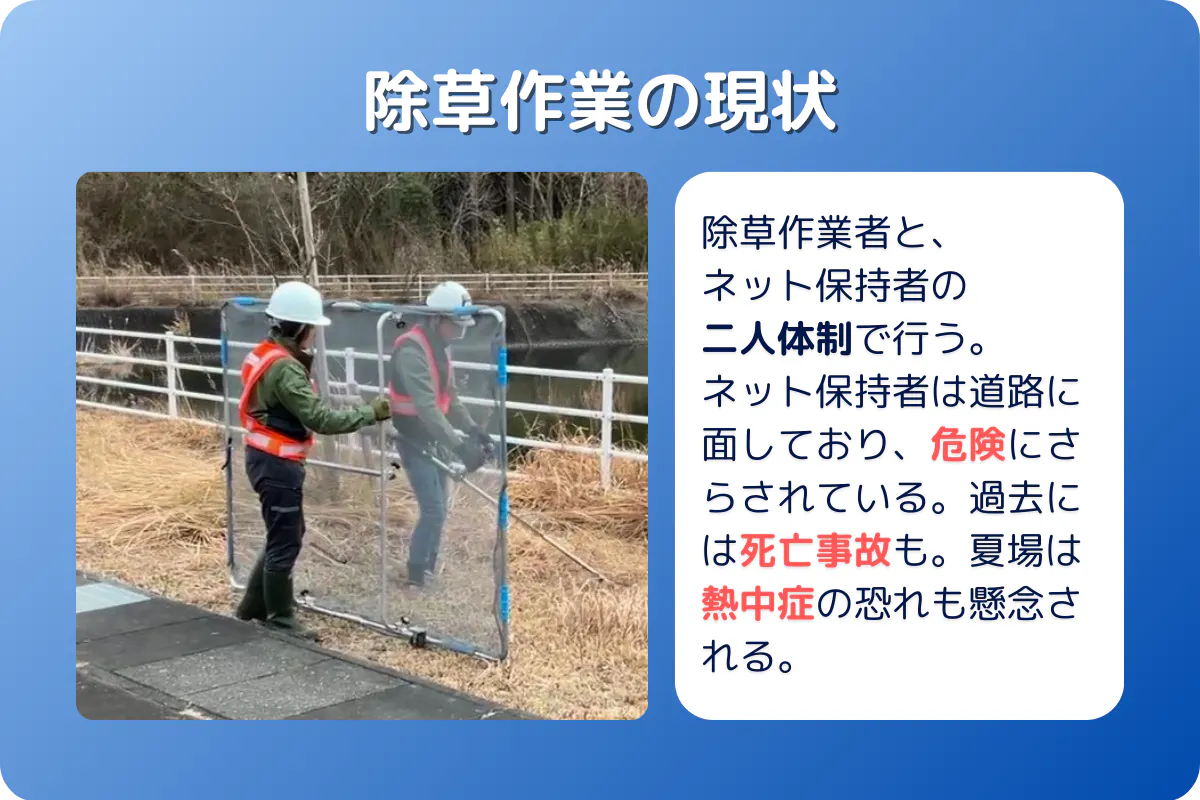 ある日、何気なく見た草刈り現場で、道路側に背を向けて作業する作業員の姿に強い危機感を抱きました。飛び石を防ぐネットを手に、車道のすぐそばで作業している──その光景に「命を守るのは、機械でできるのではないか」と直感しました。