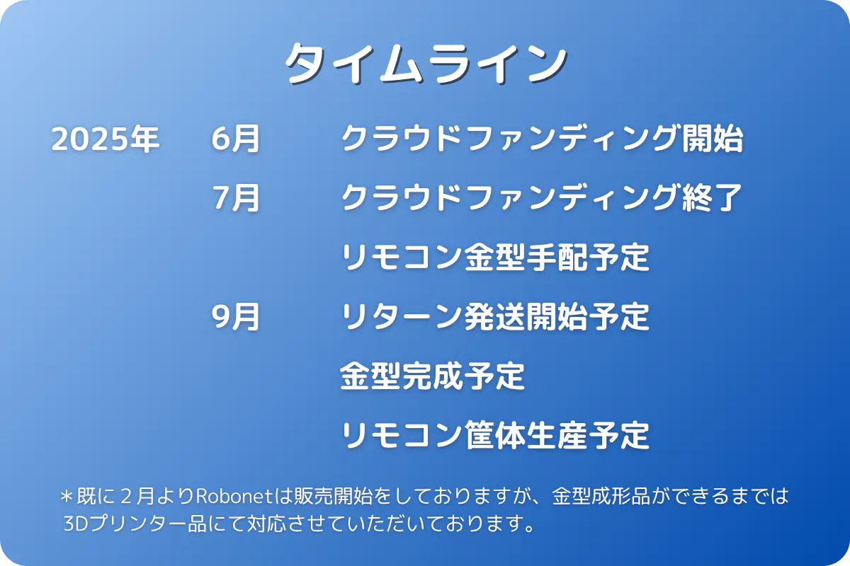 現在、Robonetは販売を開始しておりますがリモコンにつきましては、3Dプリンター品にて対応をさせていただく予定です。金型費用が確保できましたら、既に購入されたお客様には金型による成形品のリモコンと交換させていただきます。