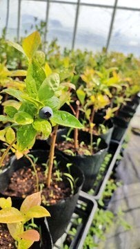 育苗ハウスは屋外より少し暖かいので、ぽつぽつ完熟ブルーベリーが実ってきました。