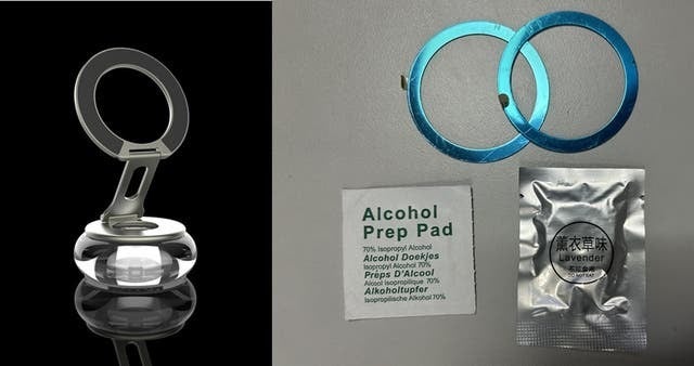 5.セット内容:スマホスタンド*1、メタルリング*2、アルコールパッド*1、ラベンダーの香りのアロマプレート*1