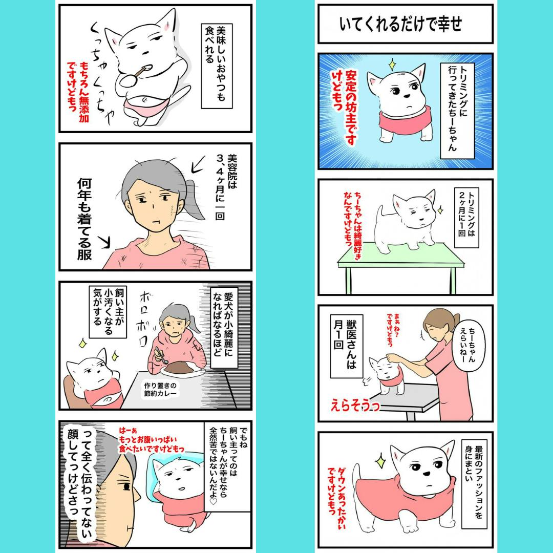 『ちーちゃんですけどもっ!』では、そんなちーちゃんとの生活を、笑いあり、涙あり、そして少しドタバタな毎日を飼い主の目線で描いています。