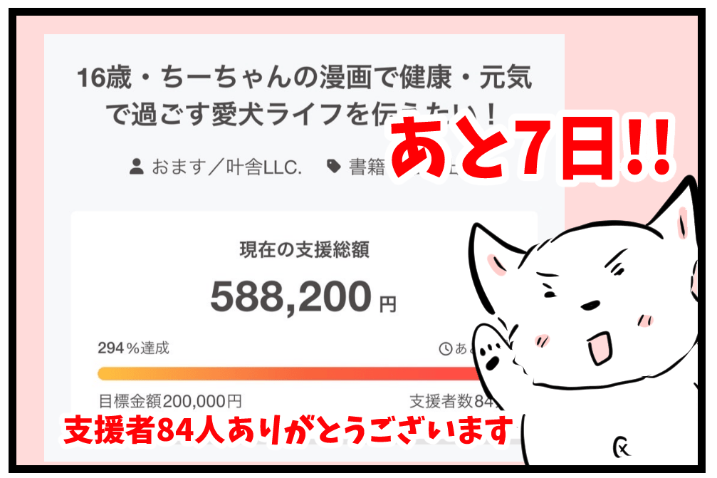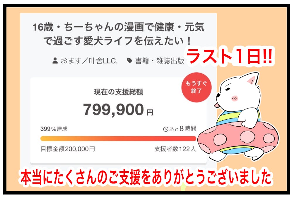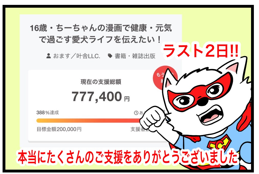 2025/06/24 19:30支援金588200円 84人!!多くの方々にご支援をいただきありがとうございます。ご支援金の使い道については以下をご参考ください↓ご支援金についてちーちゃん英語ver第3巻について【ラスト1週間オススメ返礼品をおさらい!】人気の返礼品はこちら①別冊付録は完全描き下ろし漫画!ちーちゃんの赤ちゃん時代の時のお話を収録※通常のコミックもつきます②あなたのわんちゃんを掲載します③コミック+ステッカーセットステッカーサイズは4センチ×4センチ以内防水仕様でバイクや車にも貼り付け可能です!屋外仕様OK約1ヶ月に渡り行ってきたクラファンですが残り1週間を切りました。一生懸命用意して準備しました。この企画を通してちーちゃんですけどもっを知っていただければ幸いです。ご支援金はコミック制作費に使わせていただきます。より良いコミックを作ることで皆様に還元できればと思います。本当に多くの方々にご支援していただいてありがとうございます。残り僅かとなりましたがよろしくお願いします。 もっと見る